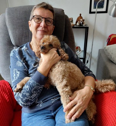 Det är alltså Ankis fina Muffin som har hoppat upp i min famn. Så fort Anki öppnade dörren kom Muffin farande och naturligtvis hukade jag så att han direkt kunde hoppa upp i famnen och trycka sig mot mig. Den hunden kan verkligen konsten att gosa.