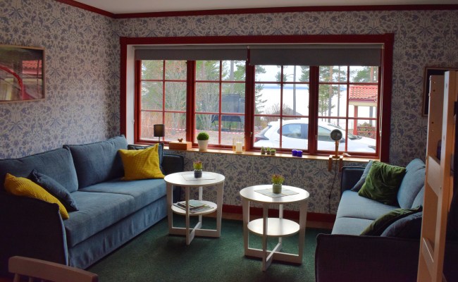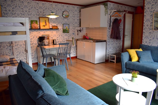 Den lilla stugan jag kom till är väldigt fräsch och känns både ny och välstädad. Jag trivs bäst med att bo i stugor där jag kan fixa en enkel måltid och ha ett eget badrum. Den här stugan har de möjligheterna och är dessutom drygt 300 kr billigare per natt än det B&B jag bodde på i Söderköping. Städning ingår dessutom vilket inte alltid är fallet. Jag väljer att inte sova i våningssängen utan i en av de skönare bäddsofforna.