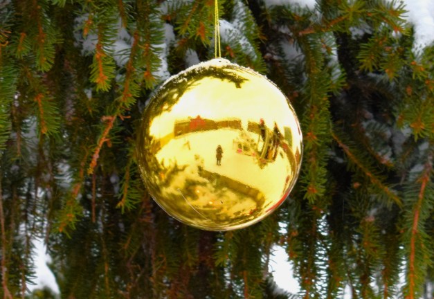 Jag och de båda granpyntarna i en guldkula.