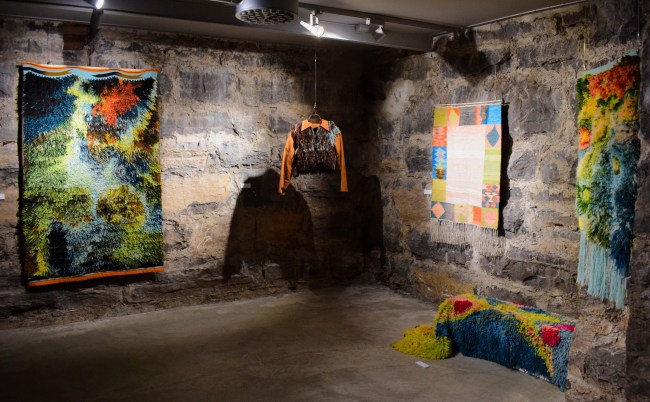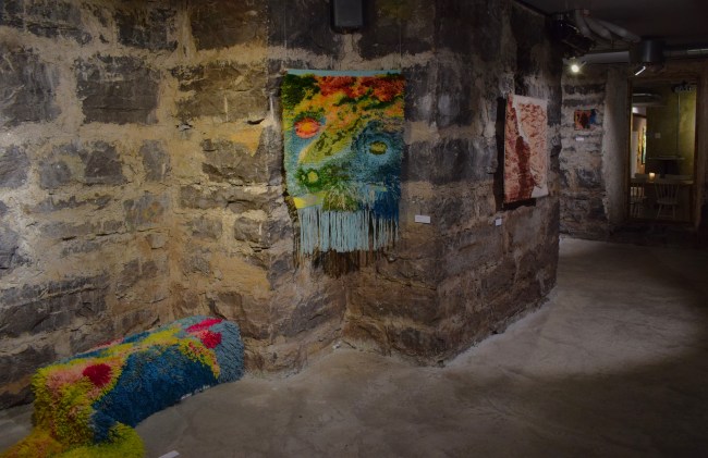 När vi hade fikat klart drog A-L med mig in i delar av byggnaden som jag inte hade trott var tillgängliga för allmänheten. Det visade sig att i de källarliknande utrymmena innanför serveringen brukar det finnas olika utställningar. Den här gången hängde ryamattor och andra textilkonstverk på stenväggarna. Färglada och vackra alster som inte hade prislappar i min klass. Jag kände ingen unken lukt eller kände av någon fukt så de här lokalerna passar nog bra för sitt ändamål. Jag var lika fascinerad av utställningslokalen som av de konstverk som fanns där.