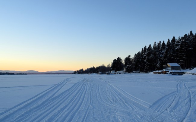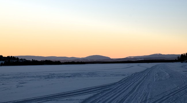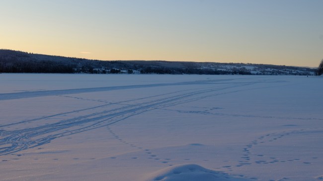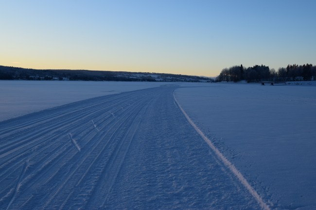 När jag kom ner till sjön stod jag en stund och tvekade och funderade på om jag skulle våga gå på isen på tillbakavägen. Då kom det en kvinna och hon pekade på skoterspåren och sa att det inte var någon fara och att hon hade gått där flera gånger. Jag såg ju att det fanns skoterspår och skidspår och jag brukar ha som regel att jag inte går ut på isen innan skotrar har kört där. Glad i hågen gick jag ut på sjön och det var ett väldigt hårt och lättgånget spår där ute.