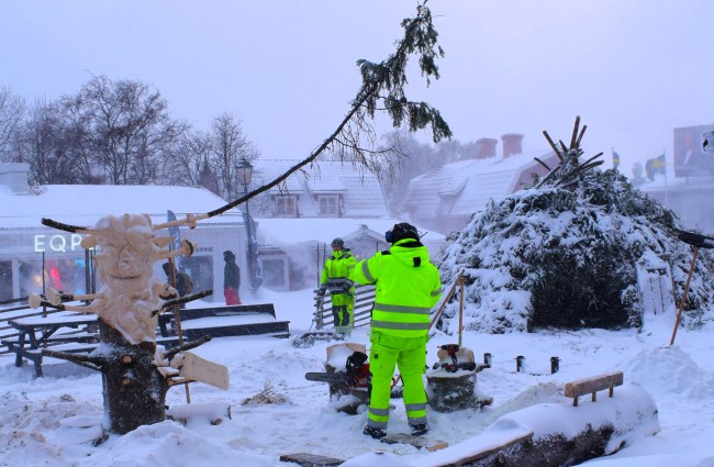 På torget kämpades det på med att slutföra arbetet med att återanvända alla granar.