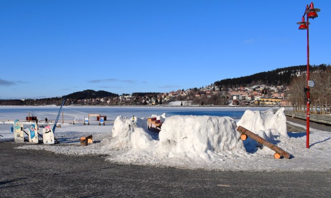 Nu är det inte mycket kvar av snöborgen i Vinterparken och om ni tittar noga så ser ni att öppet vatten närmar sig gångvägen över sjön. Men jag såg flera personer som tog den vägen och markeringarna finns kvar.