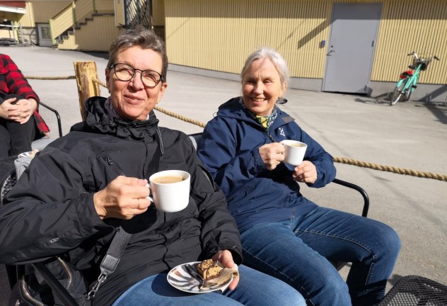 Hamngatan 12 Interiör & design – Café & Bistro. Ett långt namn på ett lite undanskymt ställe där det finns allt möjligt. Men vi var ute efter kaffe och något gott till det och det fanns det en hel del av. Jag räknade inte hur många veganska bakverk det fanns men minst 4 olika sorter minns jag. Gott kaffe var det också. Det var lä ute på gården och det var ett självklart val att sitta där ute och njuta av sol, gofika och trevligt sällskap. Vi turades om att fota varandra och då erbjöd sig en tjej vid bordet intill att fota oss tillsammans. Det var ett snällt erbjudande och med Anna-Lenas mobil blev det så här. Anna-Lena blev väldigt fin men jag…jaja, vi ser i alla fall båda väldigt glada ut.