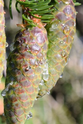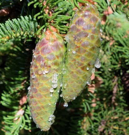 Grankottar t ex. Underliga stelnade droppar hängde på kottarna. Jag kände inte på dem men jag tycker att de ser lite klibbiga ut.