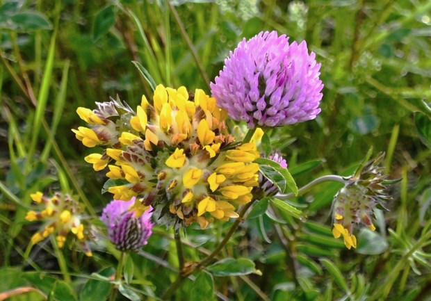 Jag tror också på Haverrot och den gula blomman tillsammans med rödklövern är Getväppling. Det för dig okända i tallen är tallens hanblommor. Honblommorna är små och röda (ca 5 mm) och sitter längst ut på grenarna.