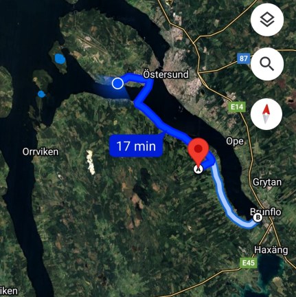 När jag berättar om var jag har varit så blir det bara namn för de flesta. Bara för att ge er en bild över hur jag har rört mig den senaste tiden så kommer här två kartor. Den första visar hur jag i morse åkte hemifrån, stannade vid brunkullorna (röd markering) och fortsatte till Brunflo. De två plupparna högt upp till vänster är Andersön (liten plupp) och Bynäset (större plupp). Den andra bilden visar hur jag irrade omkring i den västra delen av Brunflo och där det ser som mest kluddigt ut hade jag bilen och där tog jag även de sista bilderna. Och nej, jag kan inte gå på vatten utan det är google maps som visar lite fel ibland.