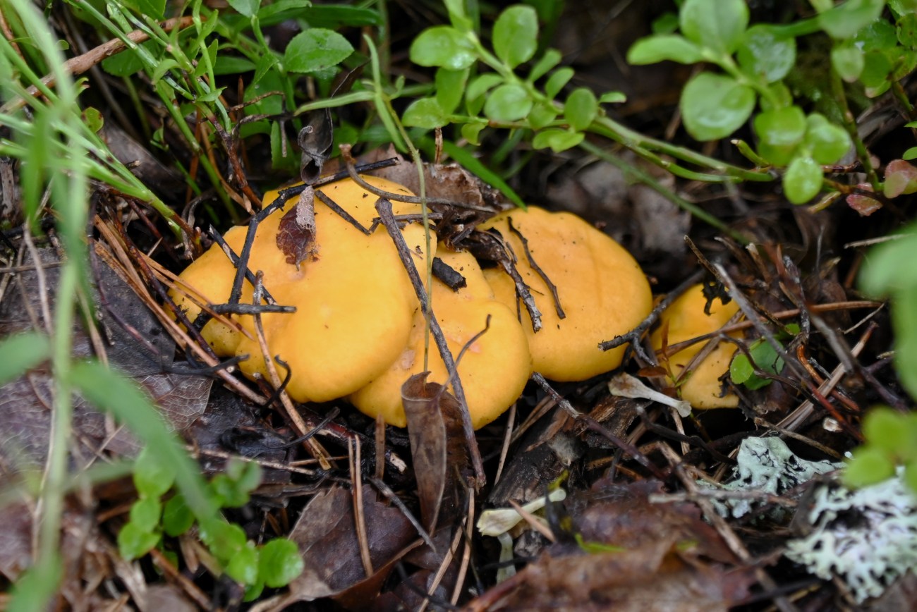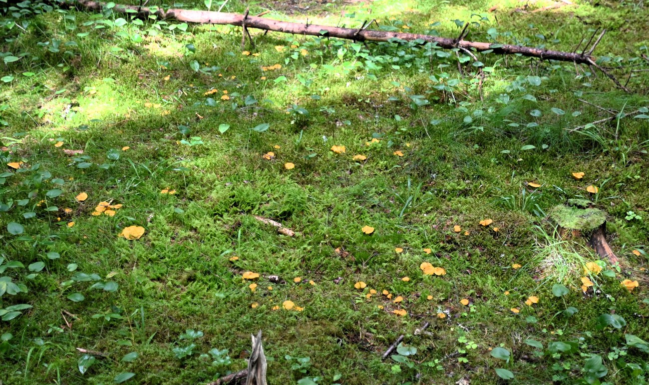 Vi kom till Gunnels bästa kantarellställe och där lät hon generöst nog mig plocka så mycket jag orkade. Hon hjälpte även till med att fylla min svampväska. Det här är bara en liten fläck och vart vi än tittade såg vi likadana kluster med kantareller.