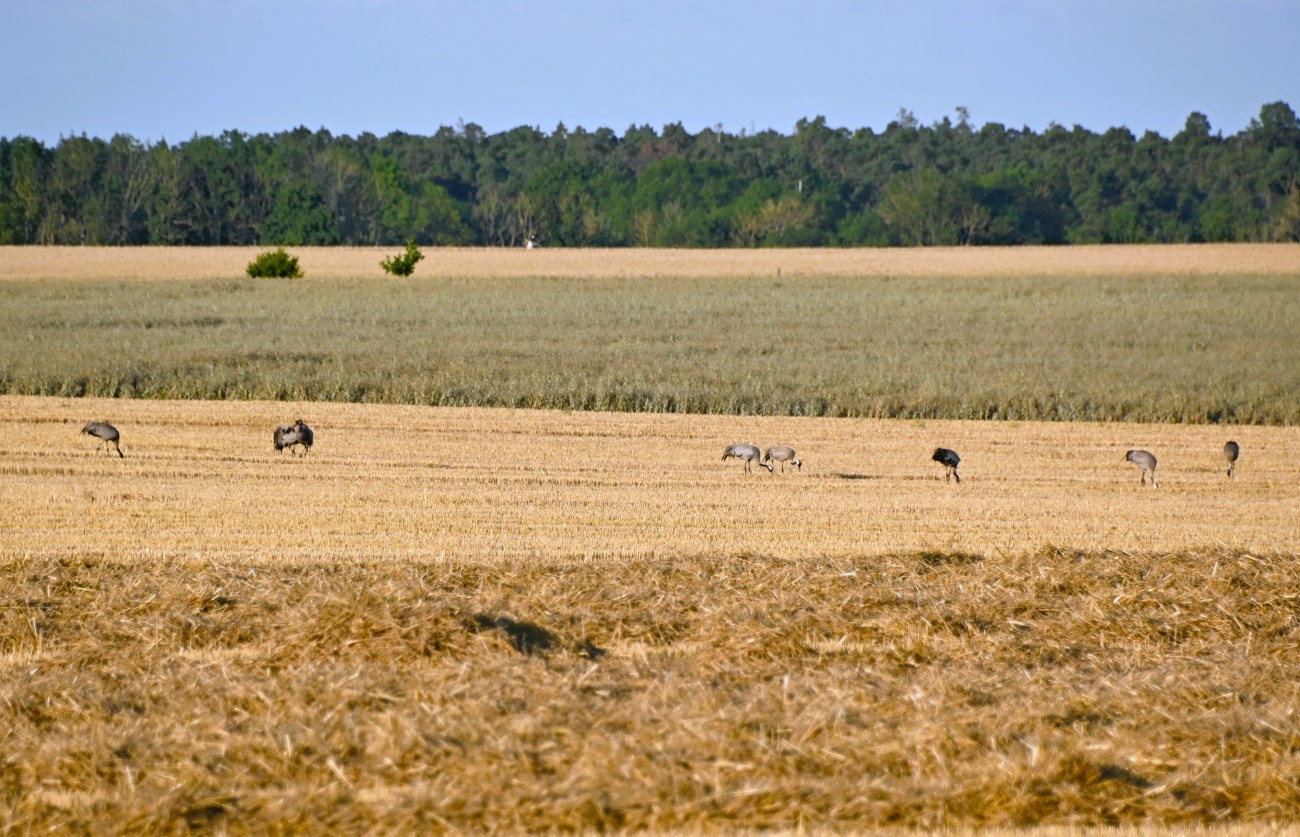 Det var dags att göra oss i ordning för att åka hem efter en härlig vecka på Gotland. Jag vaknade först och tog ut Rocky på en liten kissrunda i trädgården. Långt bort såg jag ett gäng tranor på en åker och jag gick in och hämtade kameran. Det var för stort avstånd men det blev ändå en bild där det kan anas att det finns tranor.