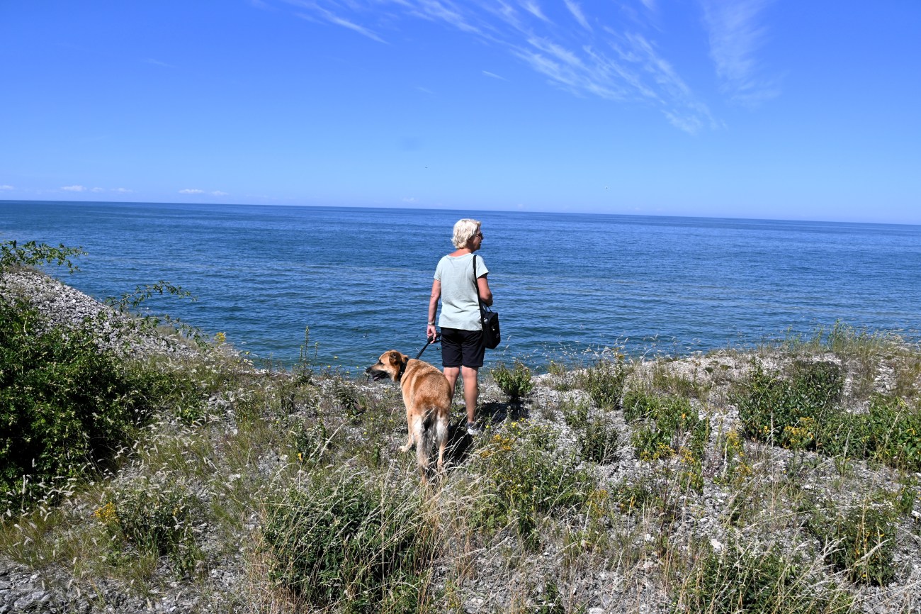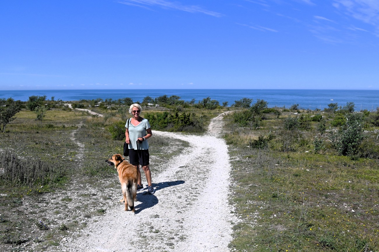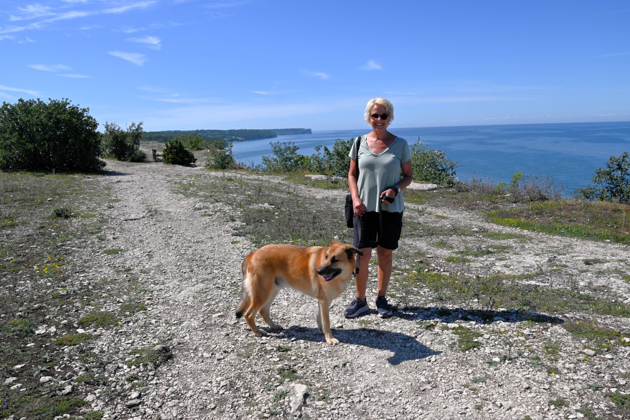 Alldeles utanför Visby, söderut, ligger naturreservatet Södra hällarna. Där ville vi fördriva tiden med en skön promenad och naturligtvis tänkte vi att Rocky skulle få njuta av flera bad. Det var varmt och solen gassade så det behövde han.