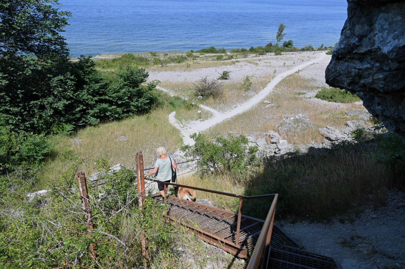Själva trappan ner var inte anpassad för hundtassar men det gick bra för Rocky att gå på sidan. Det verkade som om många hundar har gått där före honom för det hade blivit en stig.