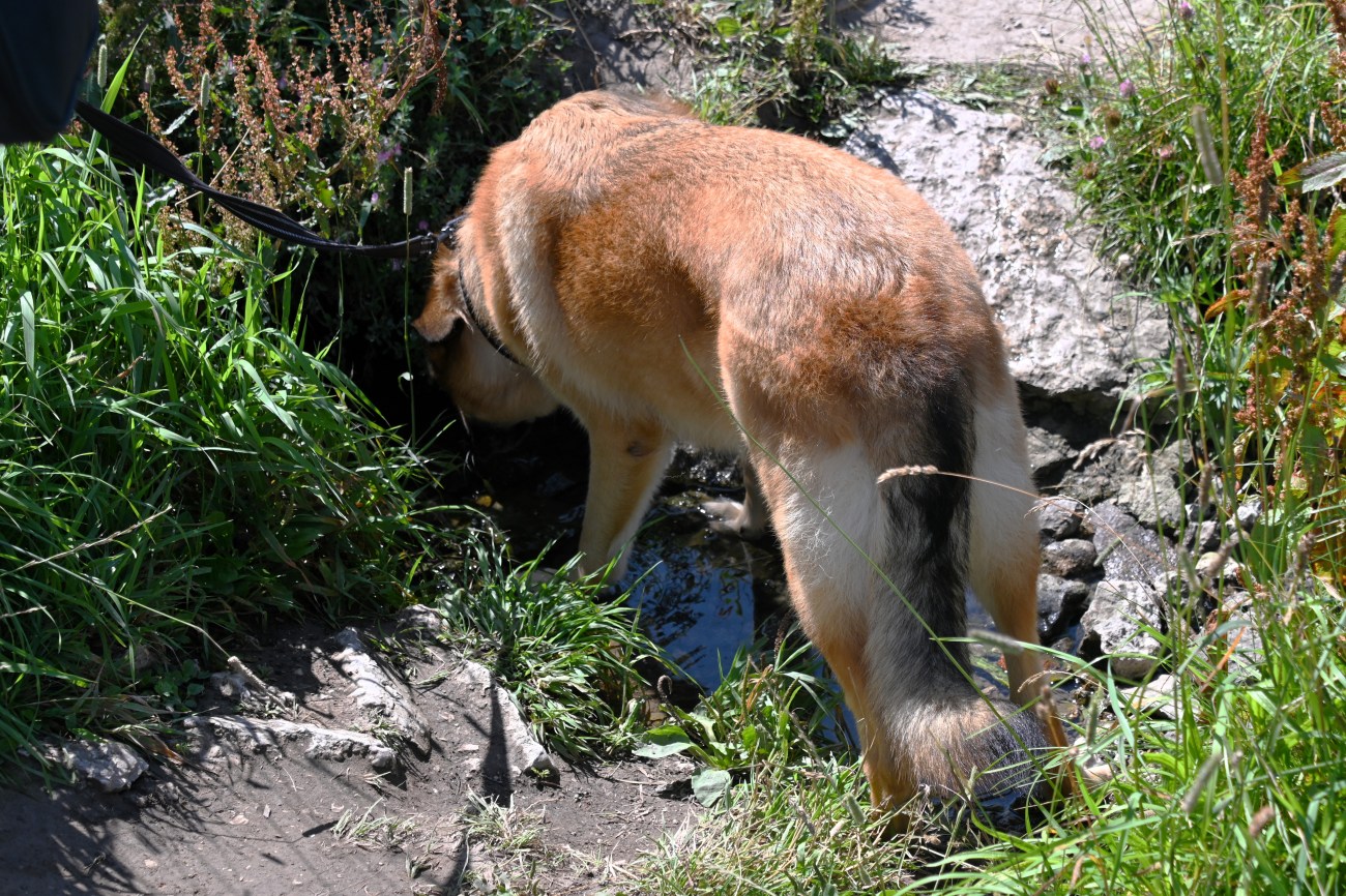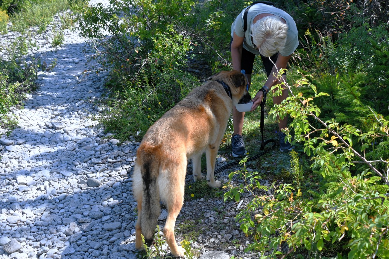 Gunnel hade tänkt på att ta med vatten och en liten skål till sin fyrbenta kompis och han drack ivrigt.
