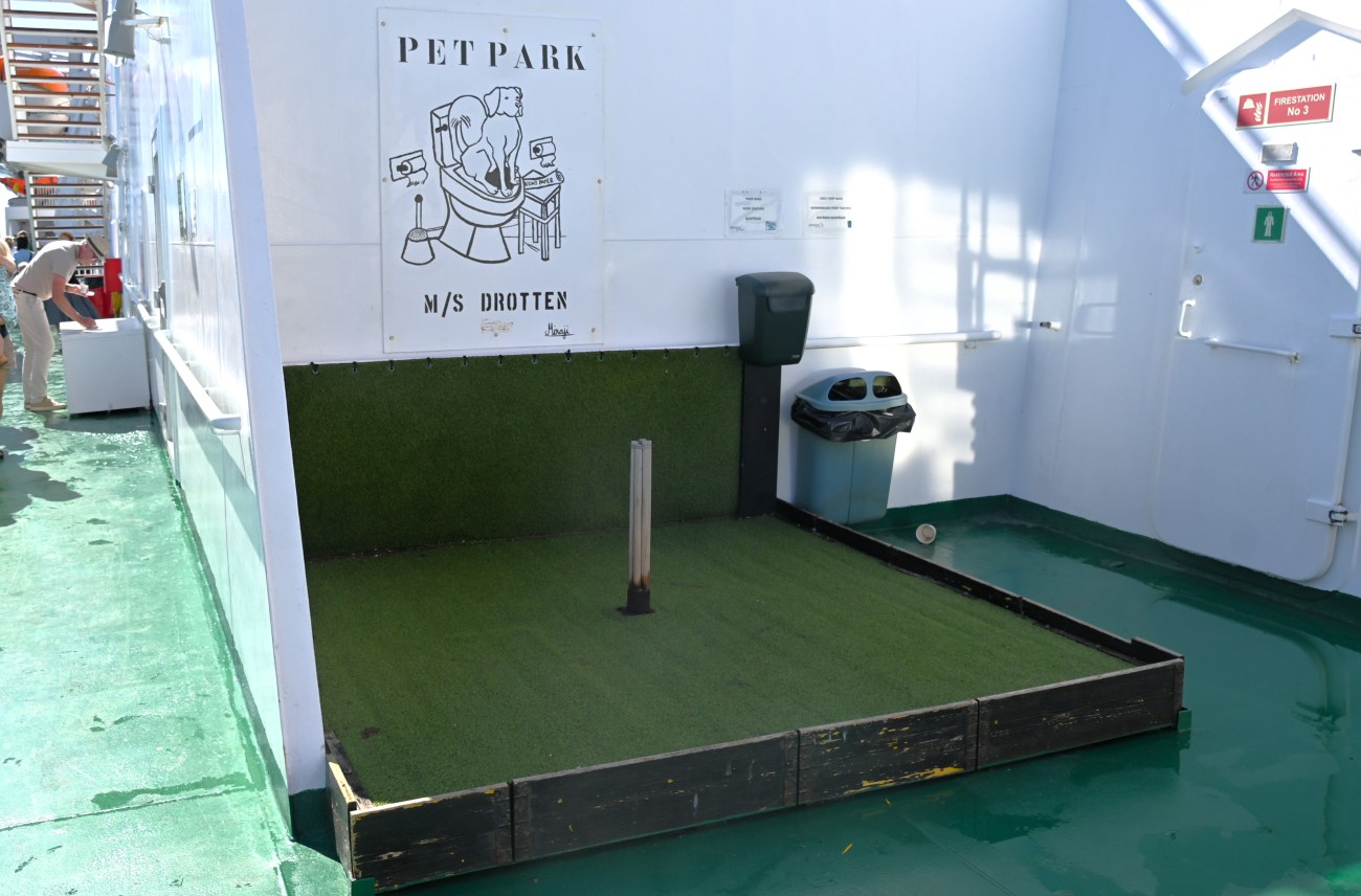 Vi åkte direkt till kön till färjan. Vi var ganska tidiga så vi fick vänta ett bra tag men Teslan har en fördel i att ha en fungerande AC även när den är avstängd. Bra i det här fallet och väldigt bra om man någon gång behöver lämna sin hund en stund i bilen när det är varmt. En skärm talar om för personer utanför att ägaren kommer snart och vilken temperatur det är i bilen. En bild på en svansviftande hund bredvid texten gör det extra tydligt. Men Rocky har inte lämnats ensam i bilen mer än några minuter då vi gick in och köpte våra hamburgare. Han är med på nästan allt.