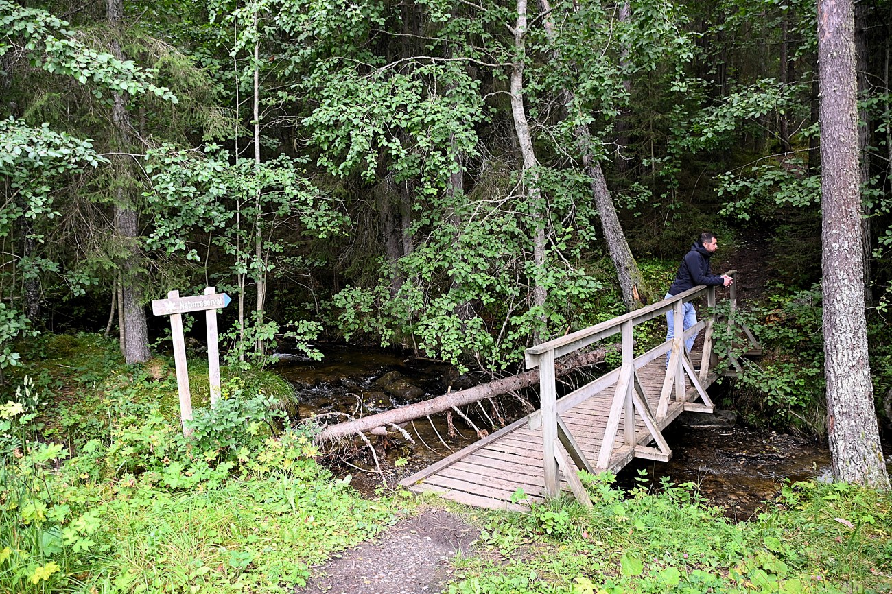 Min son skulle inte ta tåget hem förrän efter fem på eftermiddagen så vi hann med en liten runda även på måndagen. Det blåste rejält i byarna så det lockade med en promenad inne i en skog. Vi hade redan innan pratat om att gå en lite kortare runda den här dagen och jag hade föreslagit fillstabäckens naturreservat. Det är bara en tre km lång runda och det kändes lagom. Det här området ligger nästan mittemot min lägenhet på andra sidan sjön, alltså på Annersia. Vi parkerade på en lite grusplätt vid den här bron. Man ser inte mycket av Fillstabäcken under promenaden men den hörs ibland och i övrigt är det en fin skogspromenad. Inget märkvärdigt alls men det finns ändå en lite speciell plats.