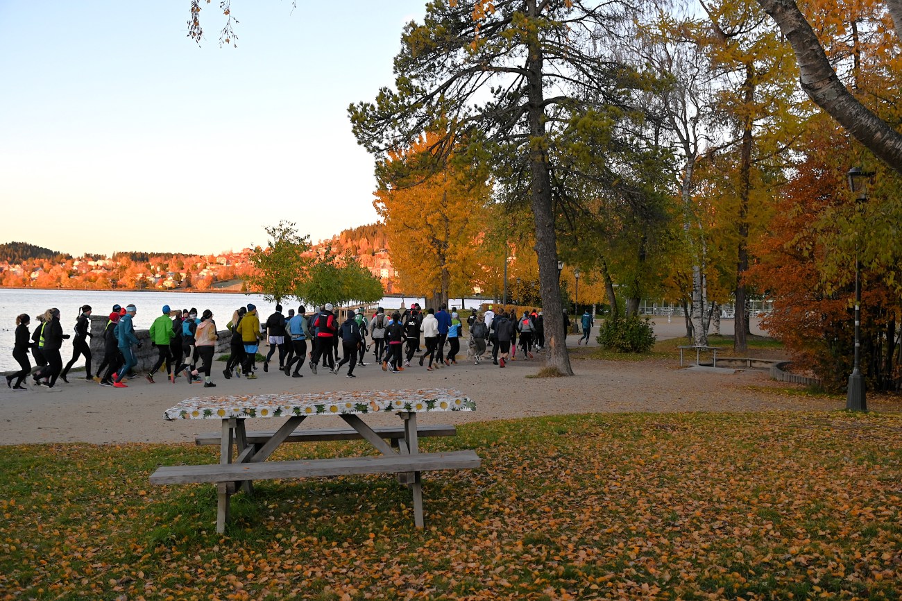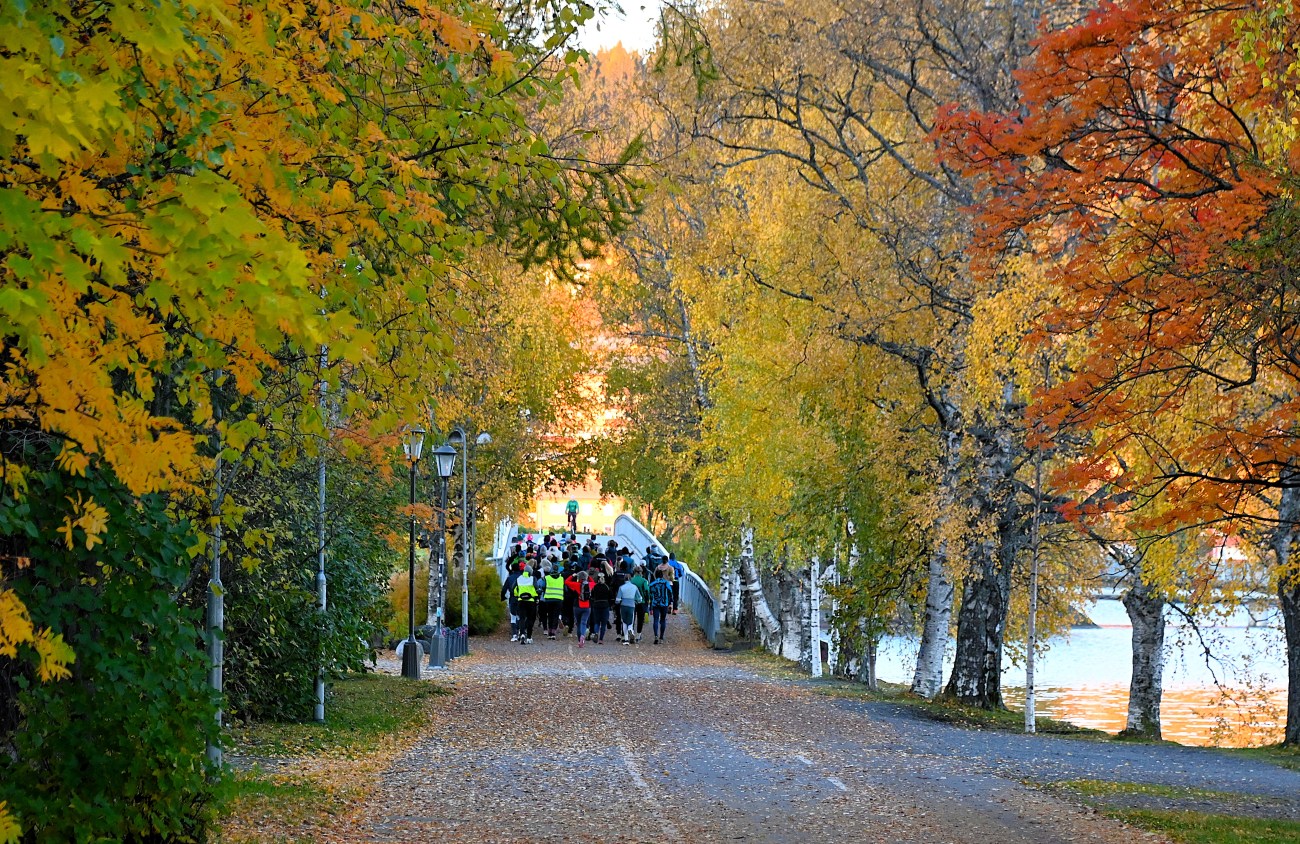 Jag hörde hojtande och glatt peppande från en grupp människor och rätt som det var kom hela gänget springande förbi mig. Jag fotade dem även framifrån men tänkte att det är nog bäst att välja bilder där de är mer anonyma. Som ni kanske ser har solen nu börjat göra Frösön gyllene. Just den där tidiga morgonsolen, som står riktigt lågt, har förmågan att göra allt till guld.