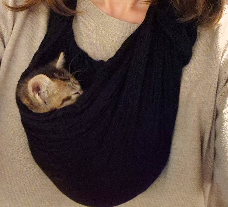 Nu kommer en liten sötchock som avslutning. Ni vet ju att min äldsta dotter har agerat jourhem åt ett antal hemlösa katter och nyss fick de två senaste fina katterna komma till ett gemensamt forever-home. Nästan direkt kom det nya katter hem till min dotter. Först en kattmamma, vars ungar nu är bortadopterade, och dagen efter kom Rolf, en liten kattunge som tyvärr är helt blind. Tanken var att kanske Poppy, kattmamman, skulle ha kvar en del modersinstinkter och ta sig an lilla Rolf. Den första dagen fräste hon åt honom men sedan började hon visa lite intresse och det såg bra ut. Men så fick hon ett sår och var tvungen att ha krage. Då var hon lite nere och brydde sig inte om Rolf. Men Rolf blev väl omhändertagen och fick väldigt mycket gos av min dotter. Här har hon tillverkat en bärsele av en sjal och där ligger han tryggt.