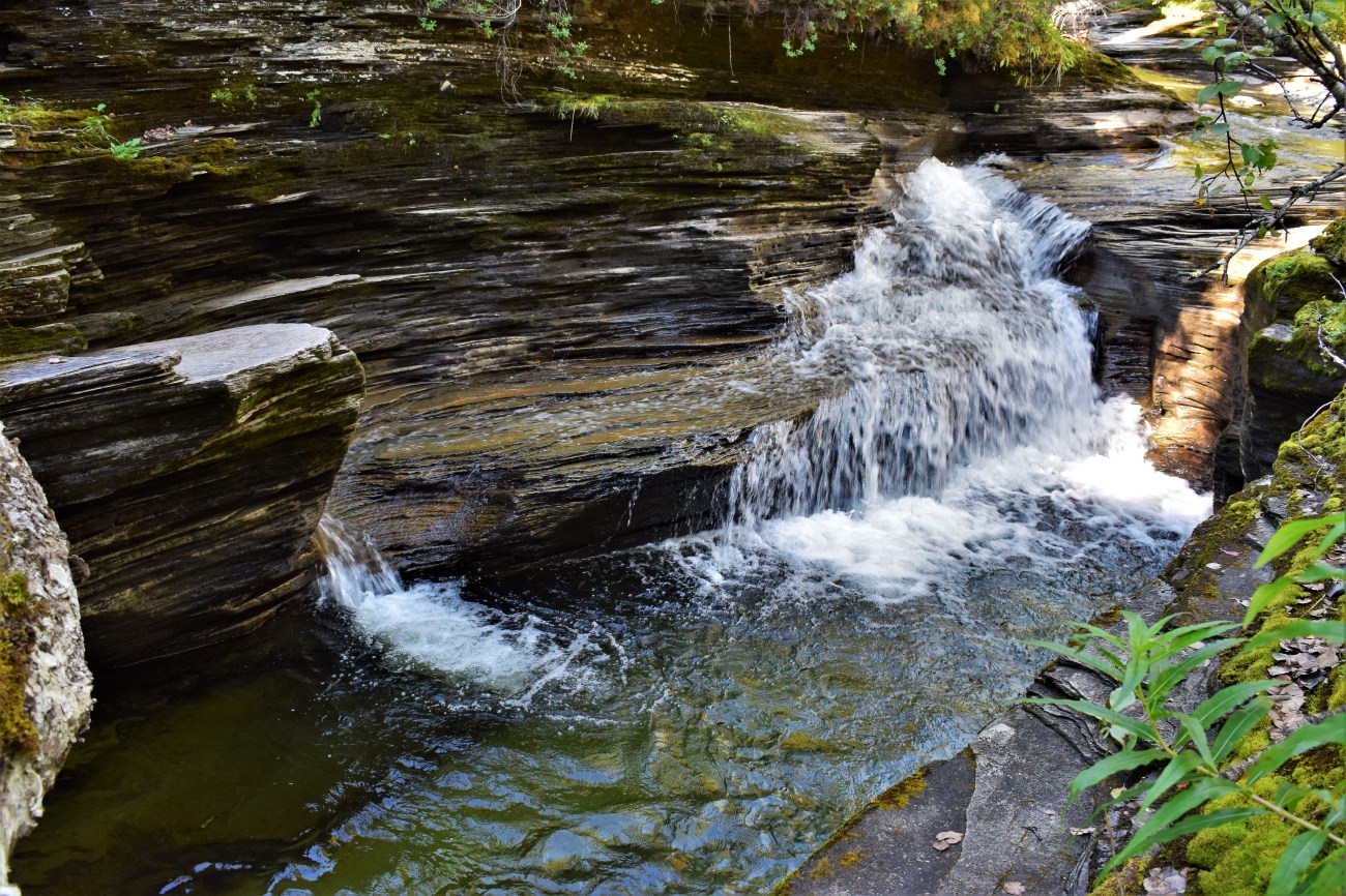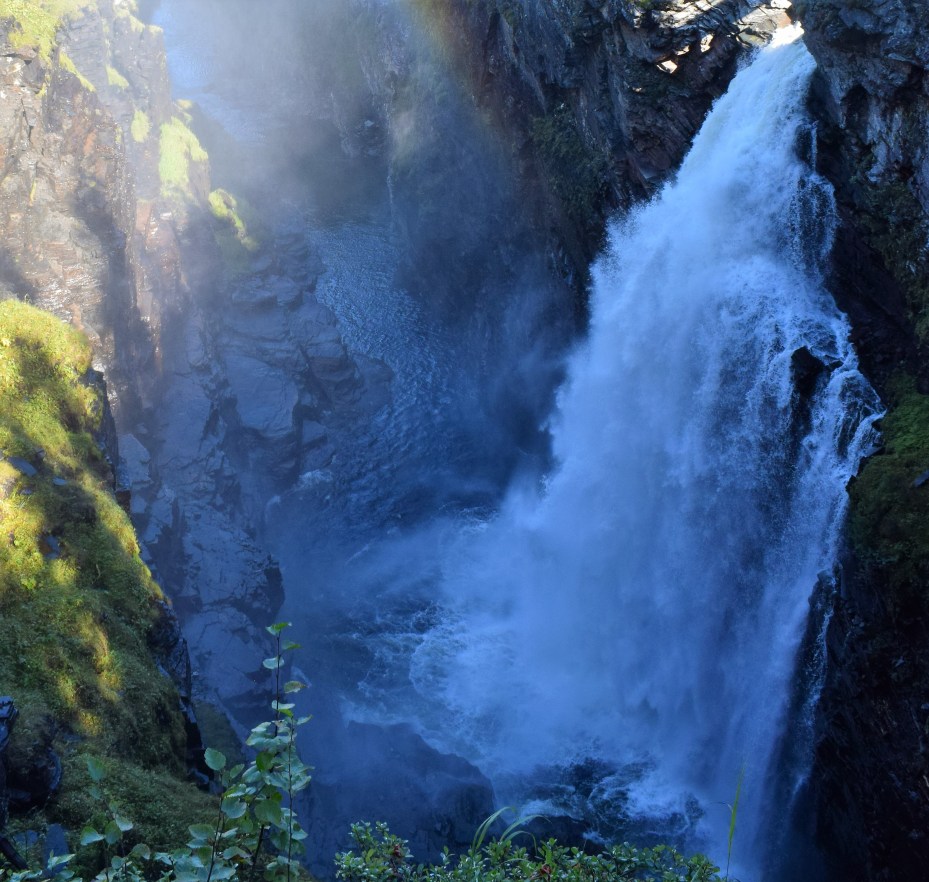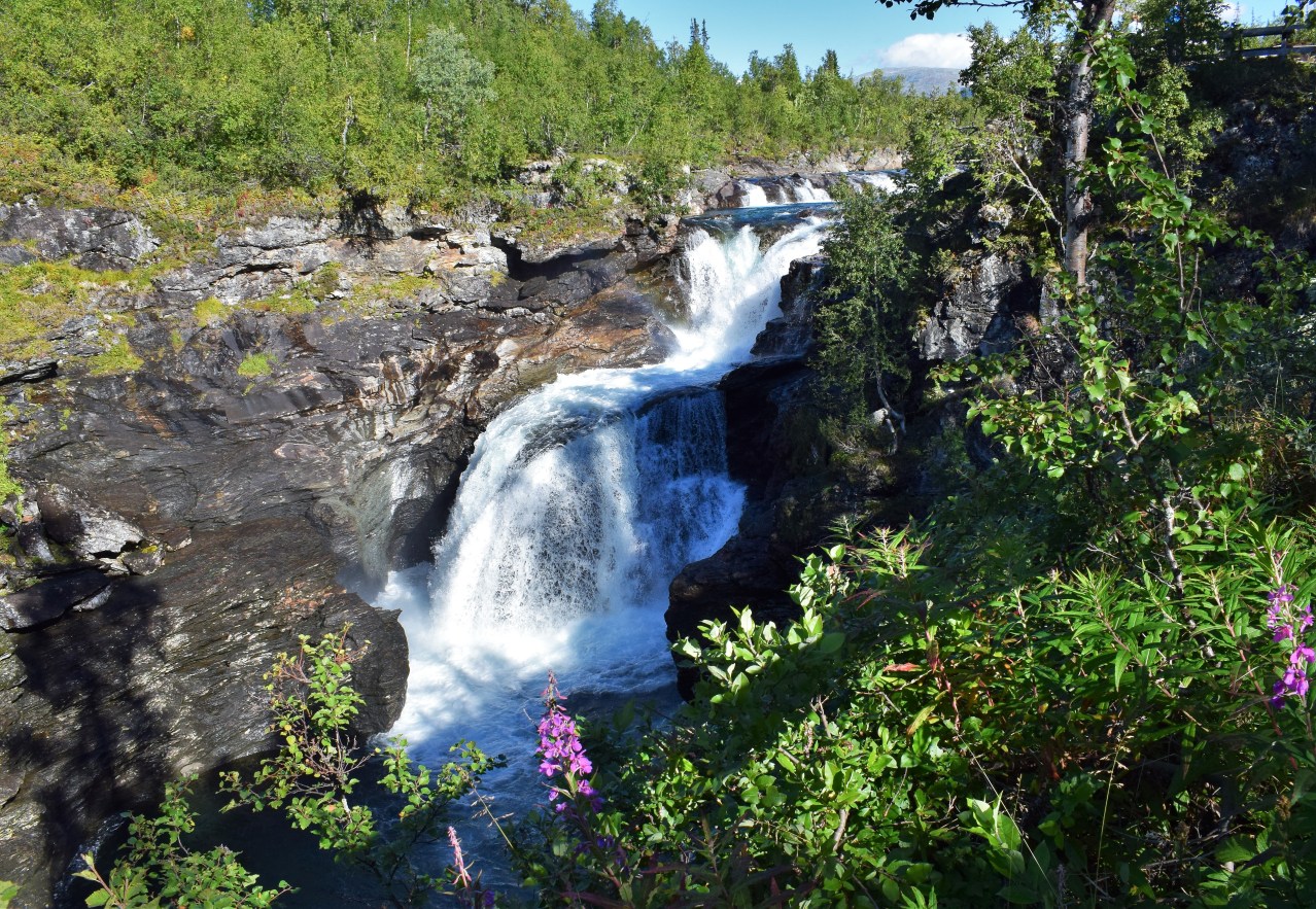 Morgonen därpå var det mulet och grått så jag väntade lite med att åka till det fjäll jag hade som mål och följde i stället en stig till Fiskonfallet. Stigen gick en bit från fallet och sikten skymdes av träd, helt eller delvis. Då kom min envisa och kanske lite dumdristiga sida fram och jag tog mig ner för den branta och hala terrängen mot forsen. Både när jag gick ner och på tillbakavägen var jag tvungen att hitta tillräckligt starka grenar att hålla mig i för att inte halka eller ramla. Men ska man titta på ett fall så vill man ju se det. Det gick bevisligen bra.