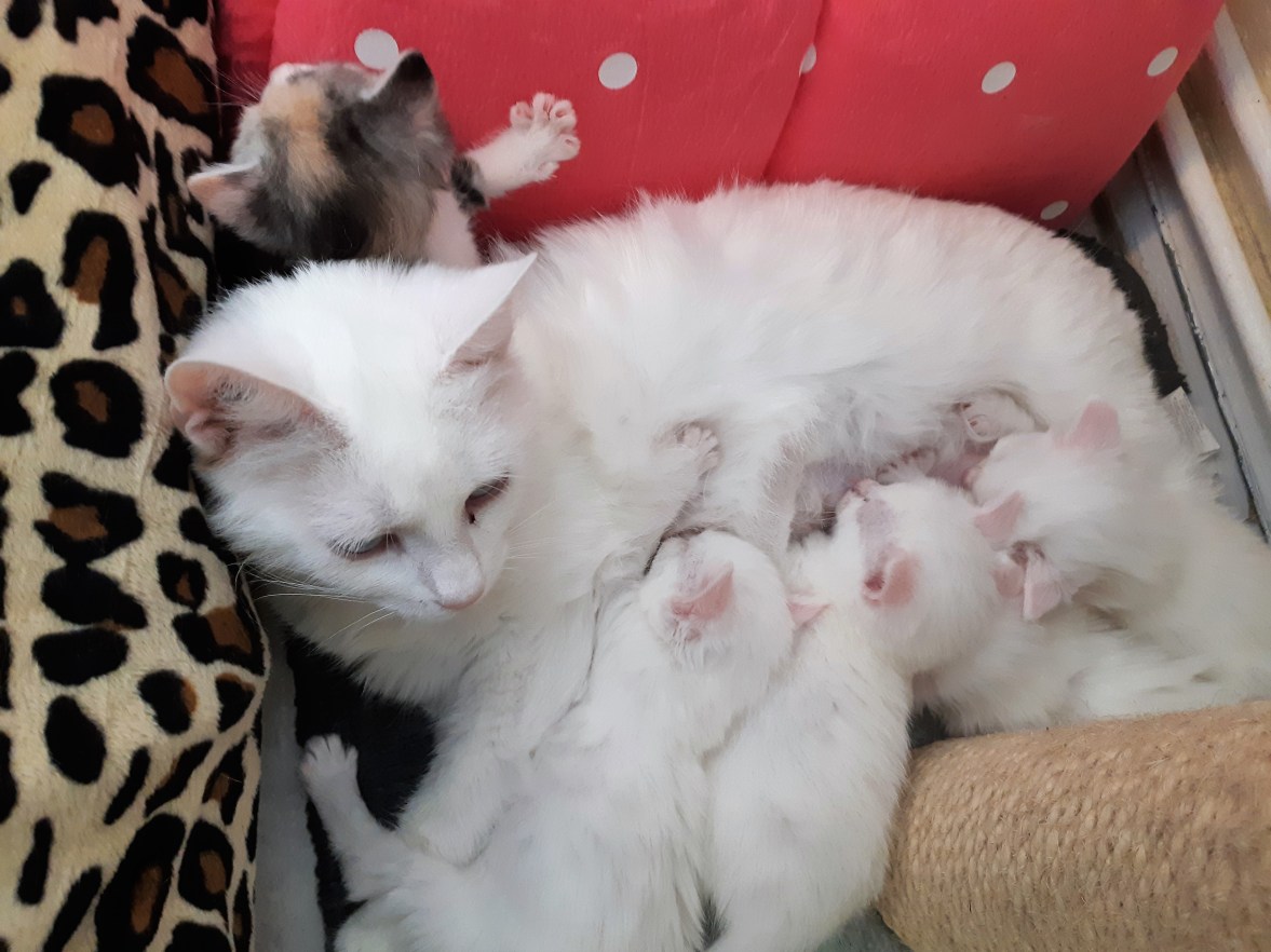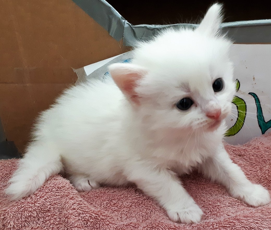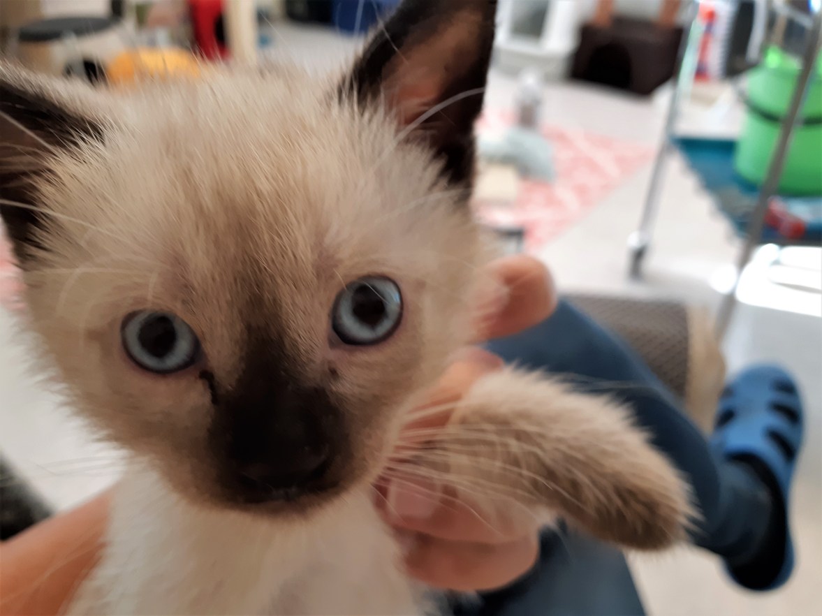 Lilla Rakel har förmodligen inget luktsinne heller och kanske har hon någon mer hjärnskada. Hon äter inte förutom från nappflaska och hon förstår sig inte på kattlådan. Hennes syskon dog vid födseln pga olika missbildningar. Rakel var hos veterinären i veckan och min dotter var nog inställd på att det kanske skulle ta slut där. Men det var en väldigt noggrann och bra veterinär som konstaterade att Rakel inte lider och om min dotter kunde orka några veckor till (det är ett heltidspassande) så kanske det går att träna upp t ex att använda lådan. Min dotter blev otroligt lättad samtidigt som hon är jättetrött och påverkad av sömnbrist och ständig passning. Hon konstaterar att hon älskar ju den där lilla skiten 😀 Vi får väl se hur det går.