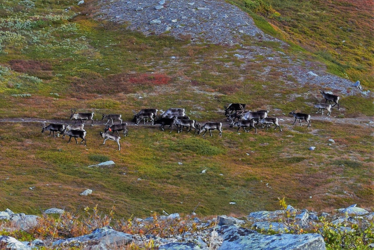 Jag kom nästan ända upp till toppen men jag medger att den sista branta biten upp dit inte lockade mig. Jag var tillräckligt trött ändå så jag vände neråt. Ett gäng renar kom på den stig jag snart skulle komma till. Renar såg jag fler gånger men det får räcka med den här bilden.