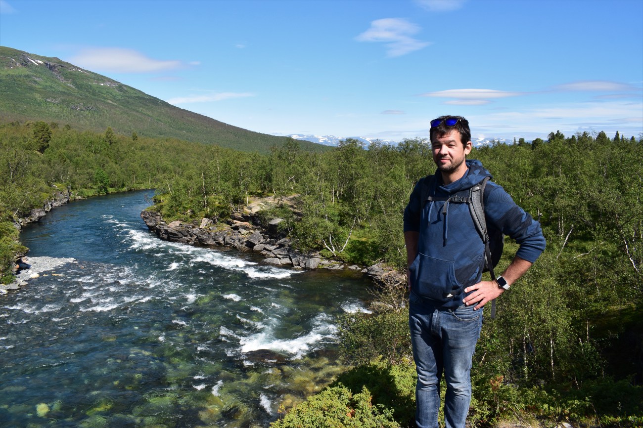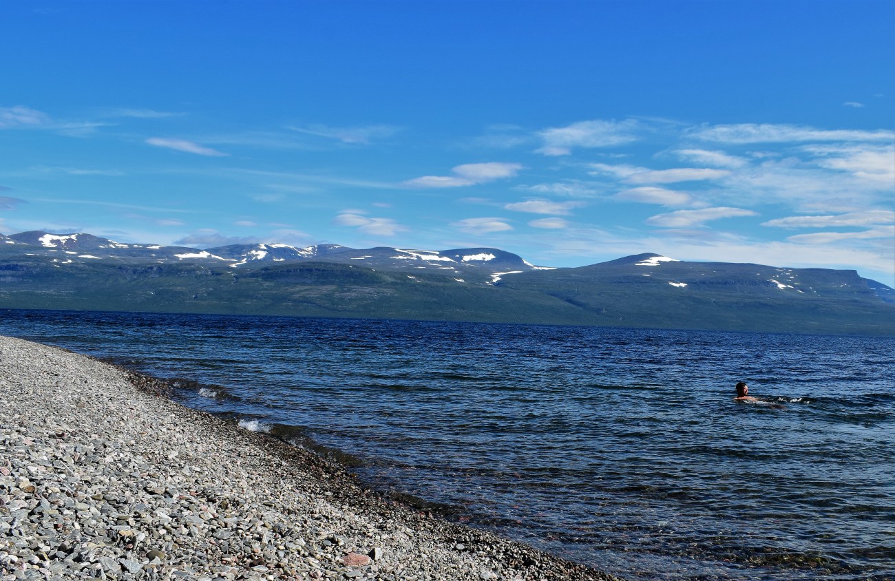 Färden fortsatte och efter att ha kommit in i Sverige igen (utan någon som helst gränskontroll) så fortsatte vi genom Kiruna och mot Abisko. På vägen dit hade vi ett ”måste göras”. Jag hade berättat för min son att både hans farfar och pappa hade gjort det till en grej att de hade badat i Torne Träsk. Min son badar gärna så han bestämde sig snabbt för att det måste han också göra. Kallt var det men jag njöt av fina vyer och höll mig varm.Nu har tre generationer av den här grenen på familjeträdet badat i Torne Träsk.