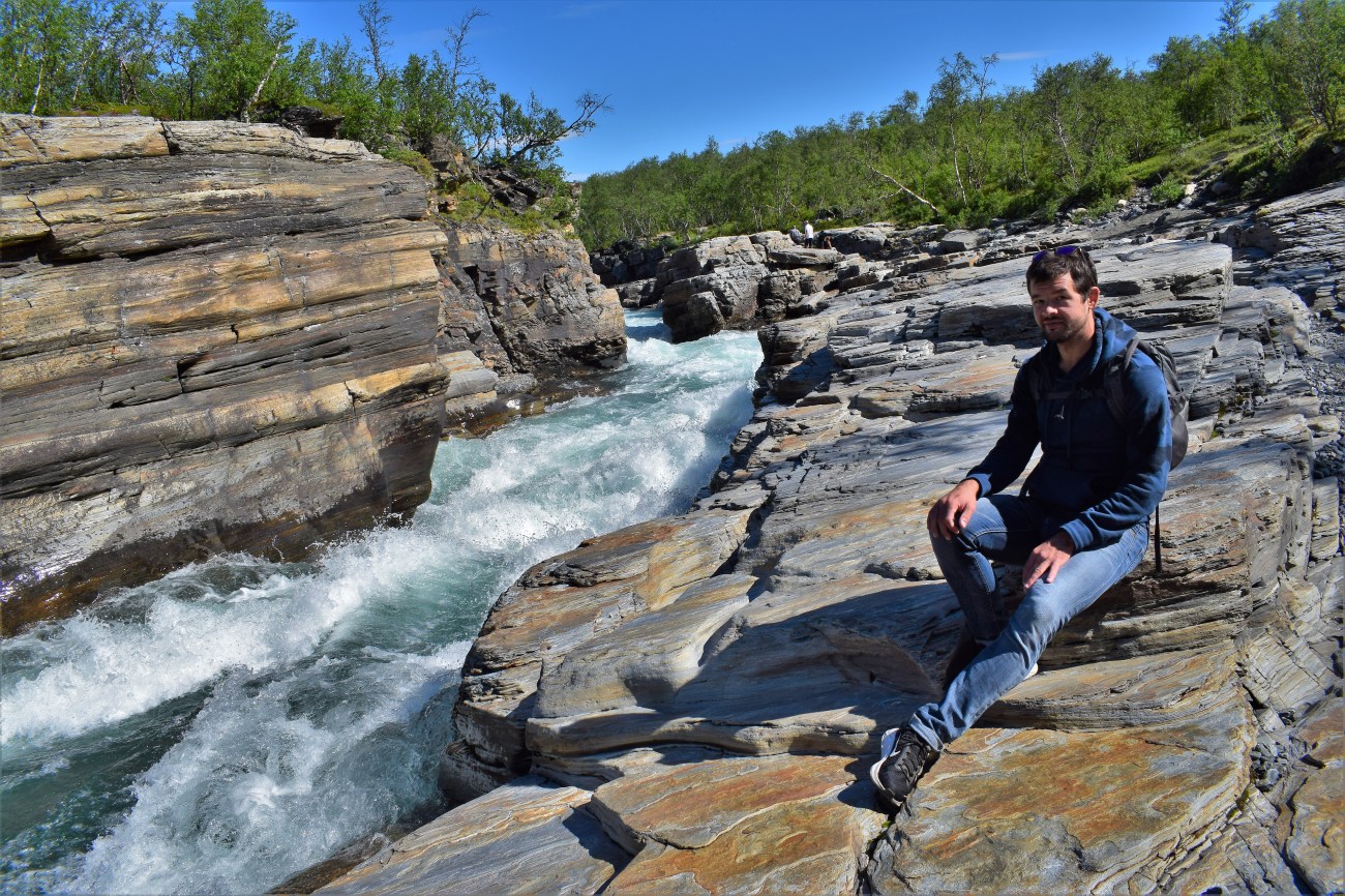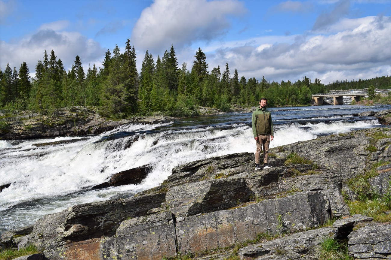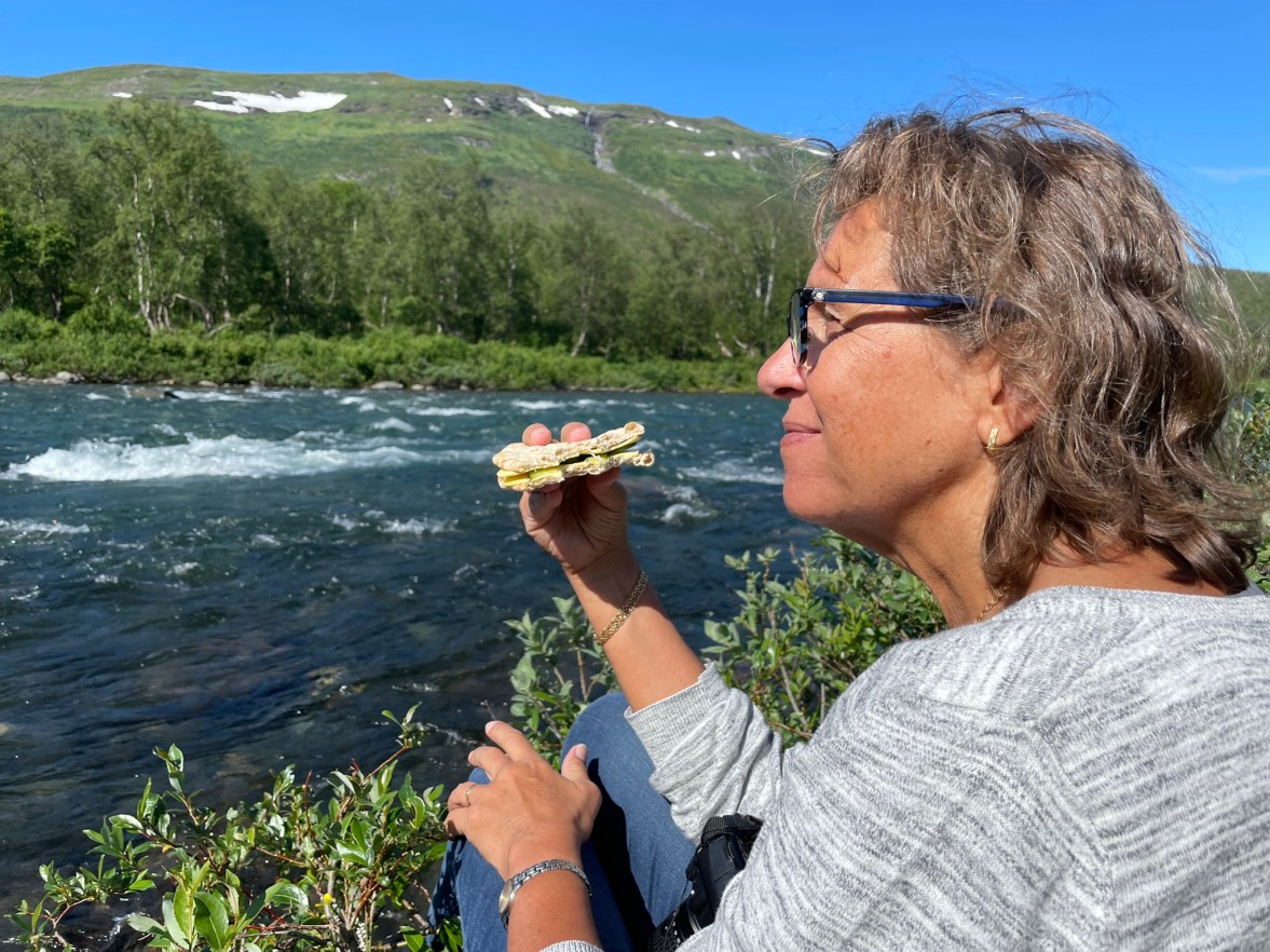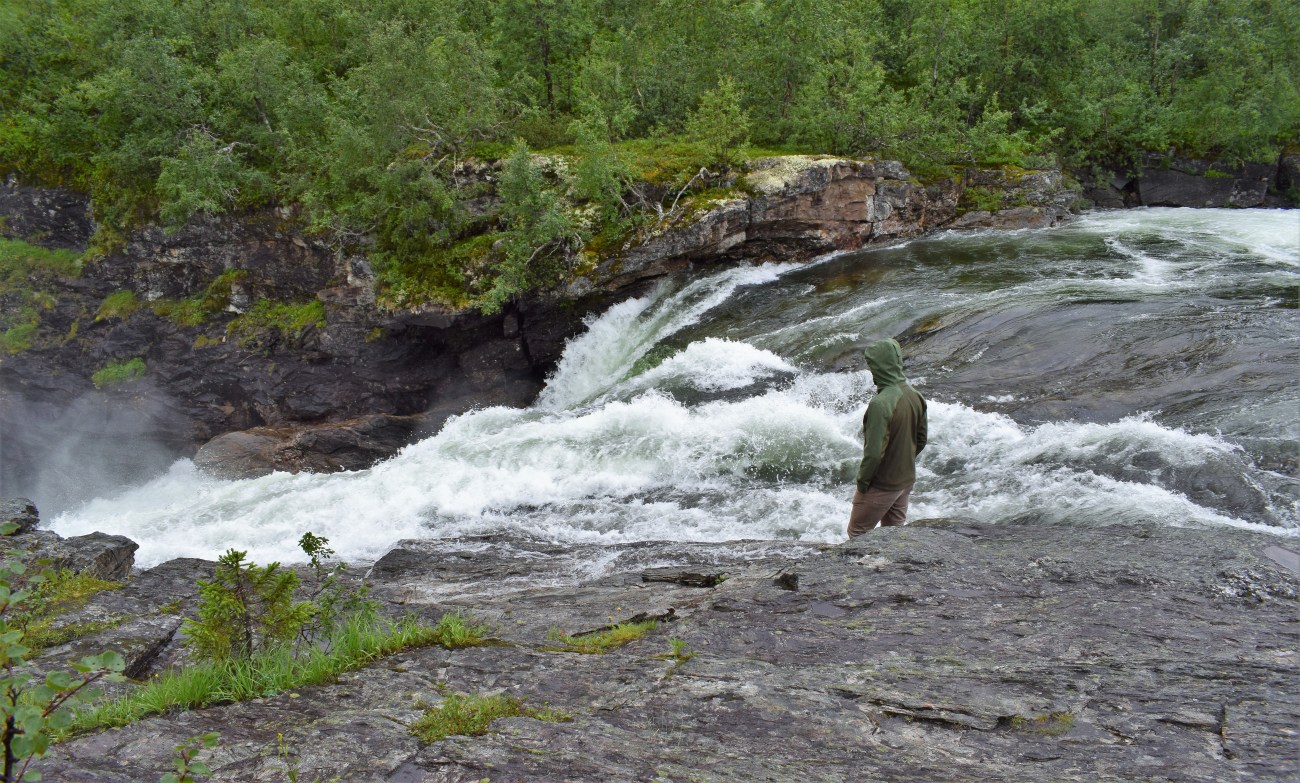 Vi satte oss och åt våra mackor med utsikt över ett av älvens vattenfall. Även den här dagen hade vi tur med vädret. Det skulle regna men vi hade uppehåll hela vandringen.