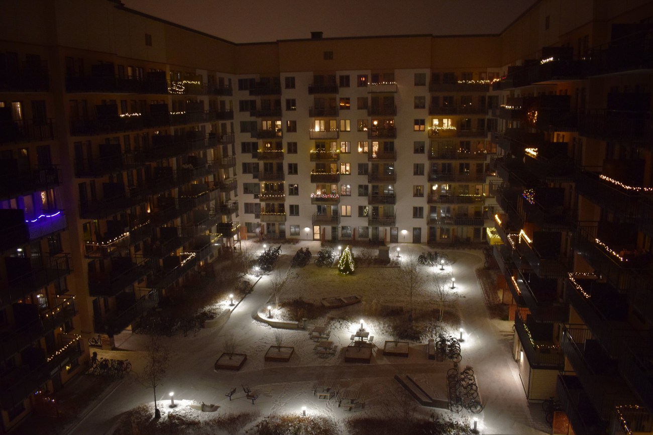 Dan före julafton kom vi iväg tidigt till Uppsala och till min son. Plan B innebar att eftersom min son troligtvis skulle jobba på julafton så skulle vi andra fortsätta hem till mig på morgonen. Vi hann med både fika och julbord innan vi kom fram till att vi ville göra ännu en ändring i vår planering. Nu blev det plan C, som vi alla tyckte blev väldigt bra. Min son fick äntligen, dagen före julafton, veta att han fick avslag på sin ledighetsansökan. Men enligt schemat skulle han jobba tidig julaftonsmorgon och komma hem vid 09.15. Självklart bestämde vi då att vi skulle stanna hela julaftonen hos honom och att jag och dottern skulle ta oss hem till mig på juldagen. Det var t o m lite julstämning från hans balkong.