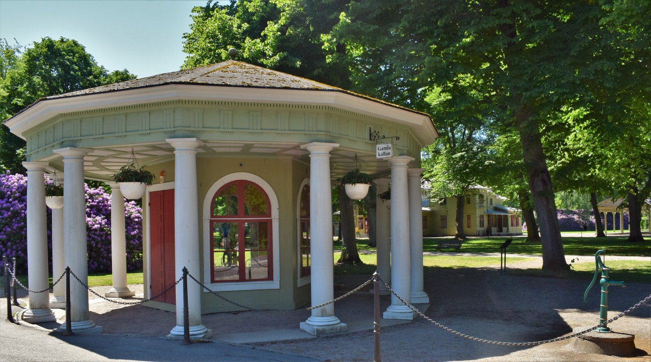 Ronneby brunn. På den lilla vita skylten som hänger utanför står det ”gamla källan”. Jag undrar om den nya källan finns under den gröna lite simplare pumpen.