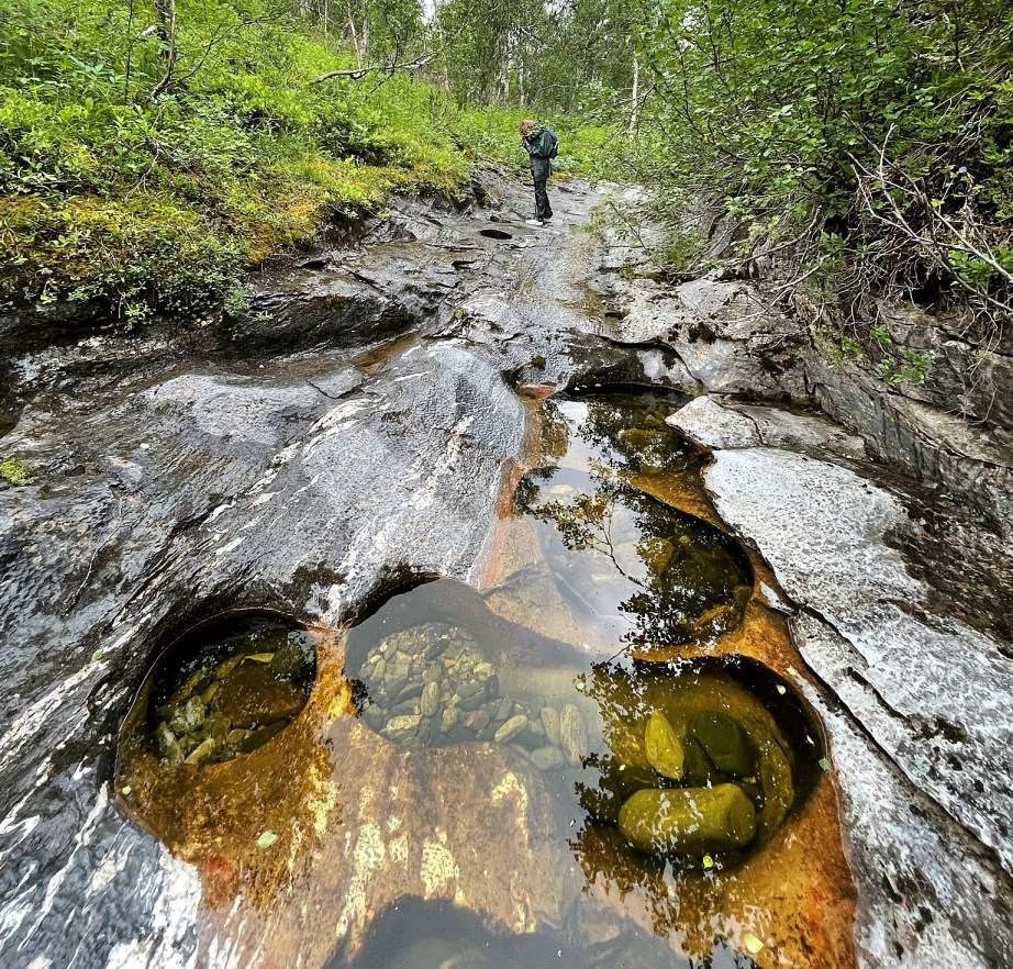 Här har vi hittat Grytrännan med massor av vattenfyllda, runda hål. Den röda färgen kommer från en alg.