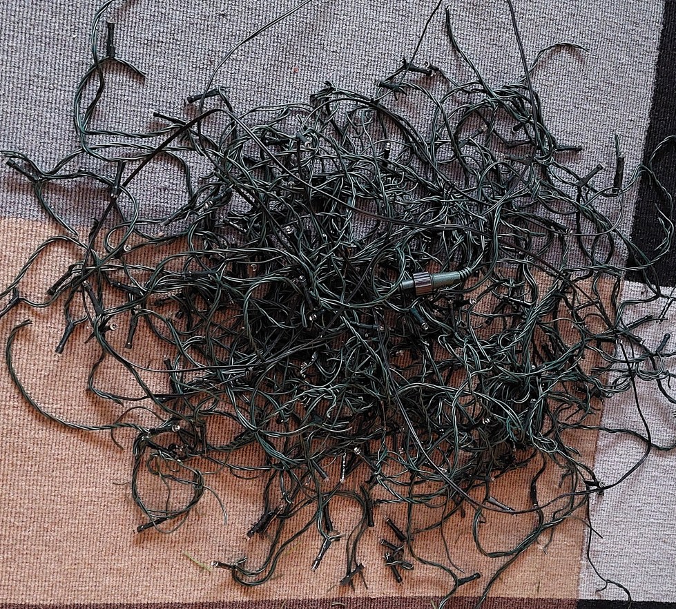Jag brukar ha tålamod med trassel men det här kändes som en nästan omöjlig uppgift. Belysningen hängde med granen när jag köpte den och den var väldigt väl snodd runt grenarna.