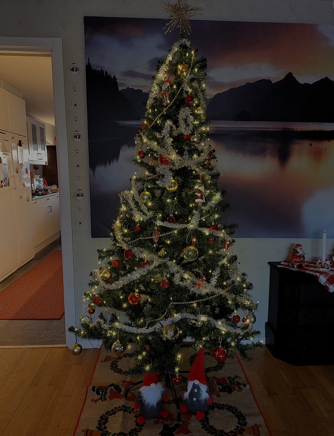 Ja, den var precis så fin som en jul ska vara 😀 Det hade varit lite trist med en mörk gran men nu hann jag lösa det problemdet. Det blev finare också med den här varmare belysningen.