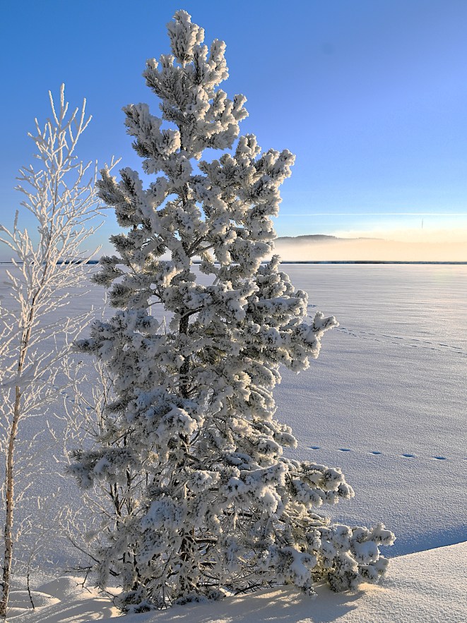 Ni förstår nog att jag njöt och som bonus blev jag överöst av pussar av två väldigt kelsugna jaktlabradorer. De visade tydligt att de ville hälsa på mig och när jag frågade deras husse om det var ok att hälsa så fick jag gärna göra det. Jag var minst lika glad som voffsingarna. I morgon verkar det bli lika fint. Kanske tar jag bilen någonstans då också för det gäller att passa på. Nästa vecka ska det töa varje dag. Snön kommer inte att försvinna men all rimfrost försvinner från träden då.