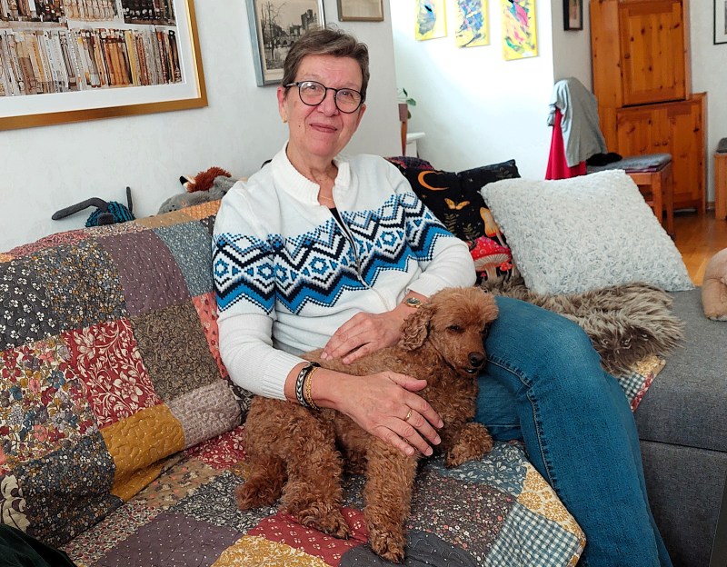 Det har varit med många hundar och katter i mina inlägg från den här resan och till min stora glädje är det fler av mina vänner som kan erbjuda gos med vovvar. Redan strax efter åtta på morgonen kom jag till bloggvännen Anki och hennes fina kompis Muffin i Finspång. Jag vet att Anki är uppe tidigt på morgnarna så det kändes inte fel att komma så tidigt. Som vid tidigare tillfällen när jag har hälsat på hos dem fick jag en liten Muffin i famnen så fort dörren öppnades. Självklart satte jag mig ner på huk så att han skulle nå upp och kanske var det jag som var ivrigast att få närkontakt. Jättekul att få sitta där, fika lite och prata bort en stund. Vi har träffats ganska många gånger nu och vi har aldrig haft svårt för att hålla samtalet flytande. Muffin är en riktig kelgris och en mysprick och jag fick ha honom nära en stor del av tiden. Matte fick också rå om honom lite.