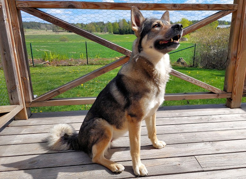 Här bor även Olga, som liknar en jämthund men som är en blandning av två raser som jag nu har glömt bort vilka de är. Men fin är hon och väldigt mjuk. Duktig på att posera är hon dessutom men det blir jobbigt att sitta och se vacker ut länge så efter en stund blev det en roligare men kanske inte lika tjusig bild.