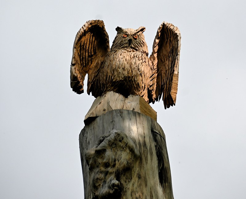 Högst upp på den stolpen sitter en uggla och flaxar med vingarna. Det finns en uggla lite längre ner också men jag fick ingen bild som duger på den.