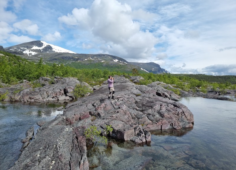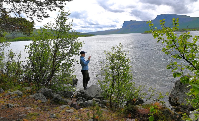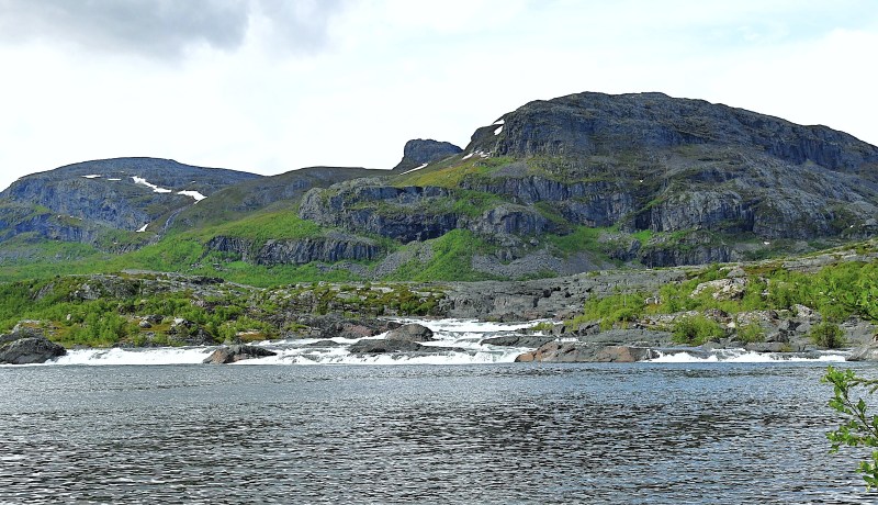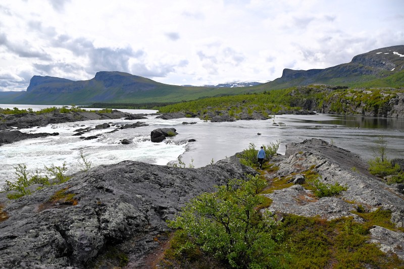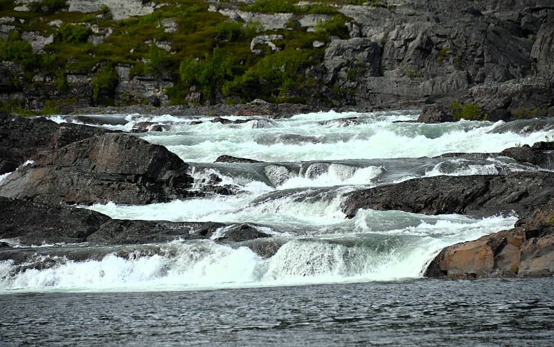 Det var betydligt snällare klippor än när vi såg fallet från den översta delen i fördämningen, eller vattenmagasinet, Akkajaure. Luleälven har olika namn i olika delar och lite längre ner mot Porjus heter den Stora Lulevatten. Självklart hittade min dotter en bra sittplats allra längst ut dit klipporna nådde.