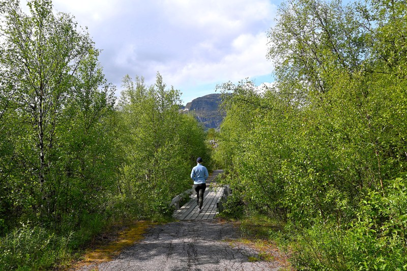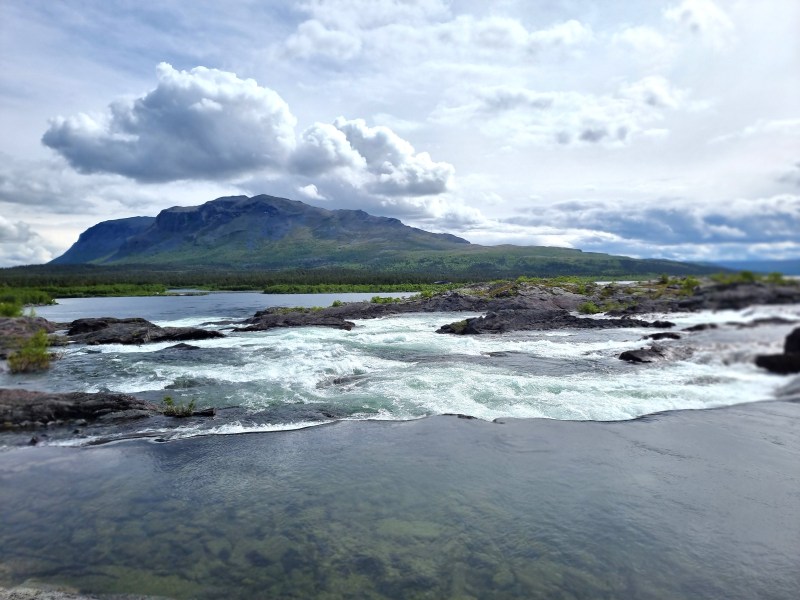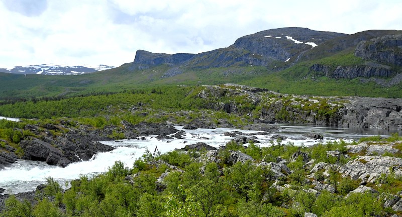 Vi vaknade båda två med stela kroppar. För min dotters del var det träningsvärk och för min del både träningsvärk och lite annat. Men det brukar släppa lite när man rör sig och vi ville inte avstå från den lilla utflykt vi hade tänkt oss. Vi gjorde oss alltså i ordning för en väldigt kort promenad till udden där resterna av Stora sjöfallet rinner ut i Luleälven. Vi körde så långt vi kunde och därifrån var det en promenad på ca 200 m. En väldig skillnad mot dagen innan.