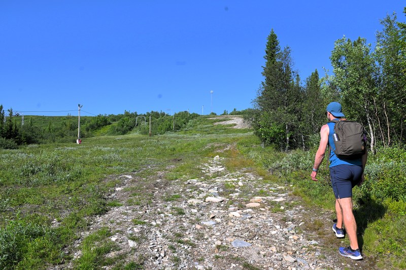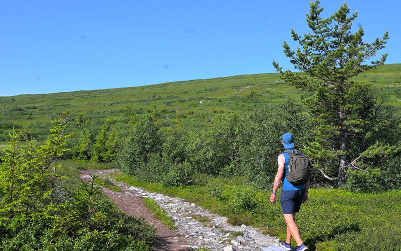 Dagen efter, på söndagen, åkte vi alltså till Gräftåvallen, en fjällanläggning där jag har varit några gånger tidigare och vandrat. Första gången tog jag mig upp på Östfjällets topp och vägen dit gick upp och ner för flera toppar och dalar. Andra gången följde jag ungefär samma led som jag och min son gick på igår. Båda gångerna njöt jag men den här gången gjorde vädret att det blev en skönare upplevelse. Inga renar dock och kanske höll de sig undan sol och värme. Det var ca 27 grader ute och det är normalt sett för mycket även för mig. Men med en skönt fläktande vind blev det väldigt bra. Vi startade vid fjällanläggningen och gick uppför backen vid liften.