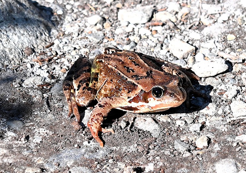 Vi såg tre renar strax innan vi kom fram men tyvärr hann jag inte fota dem. Alla de renar jag såg förra gången, då vädret förmodligen gav dem bättre förutsättningar att vistas uppe på kalfjället, höll sig nog i skuggigare områden. Men det finns ju andra djur och den här lilla krabaten låg alldeles stilla på stigen och försökte nog vara så stilla att vi inte skulle se den. Men det var ett misslyckat försök och min son lyckades precis se den innan han av misstag skulle ha trampat på den. Jag hoppas att den tog sig till ett bättre område med både grönska och kanske lite vatten.