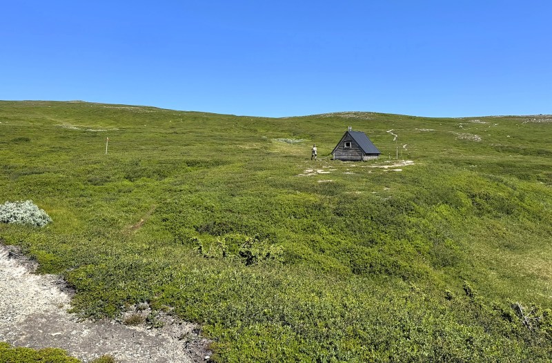 Vi valde att vika av från den led vi hade tänkt följa och gå ner till Tväråns rastskydd, en liten stuga som ni kan se till vänster i bilden.