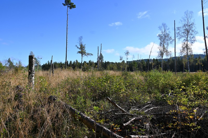 Det var länge sedan jag gick här så jag kom inte ihåg hur det såg ut. När jag kom fram kände jag att nej, det här orkar jag inte ta mig igenom. Jag var redan blöt om båda fötterna och här såg risken för att stuka en fot överhängande ut. Jag såg dessutom ett jakttorn och blev osäker på om förra veckans älgjakt var över. Men i skogskanten bakom mig fanns det gott om lingonris. Inte så många bär dock och återigen kom jag hem med bara ca en halv dl. Nu har jag alltså totalt 1 dl i frysen och kanske kan det bli lite till.