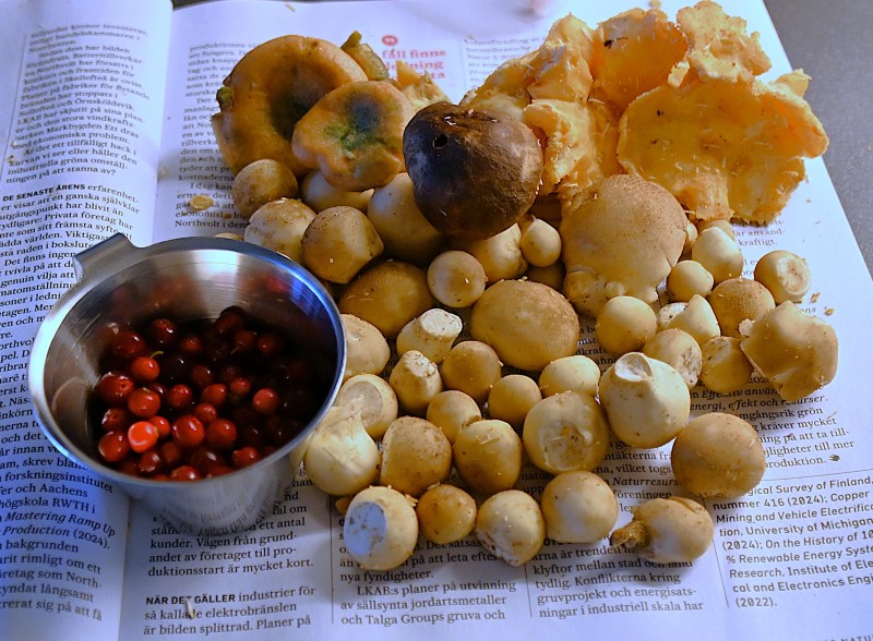 Några blodriskor och en liten Karl Johan hittade också ner i svamppåsen och det här blev gårdagens skörd. Många bäckar små… Jag smakade lite försiktigt på en bit av den lilla Karl Johan bara för att utesluta att det var en gallsopp. Den smakade väldigt bra.