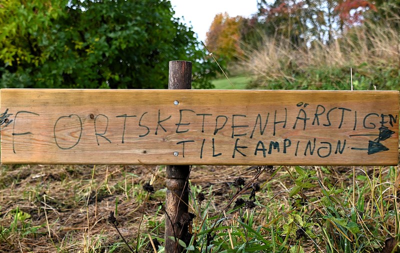 Jag har sett hos dig att du har precis lika härliga höstfärger där och jag håller inte alls med om att jag är en bättre fotograf. Jag har beundrat många av dina fina bilder i olika inlägg. Texten på skylten är helt klart skriven av ett barn och jag kan översätta det till ”fortsätt den här stigen till campingen” För jag tror inte att betydelsen ska vara fort sket stigen… 😀