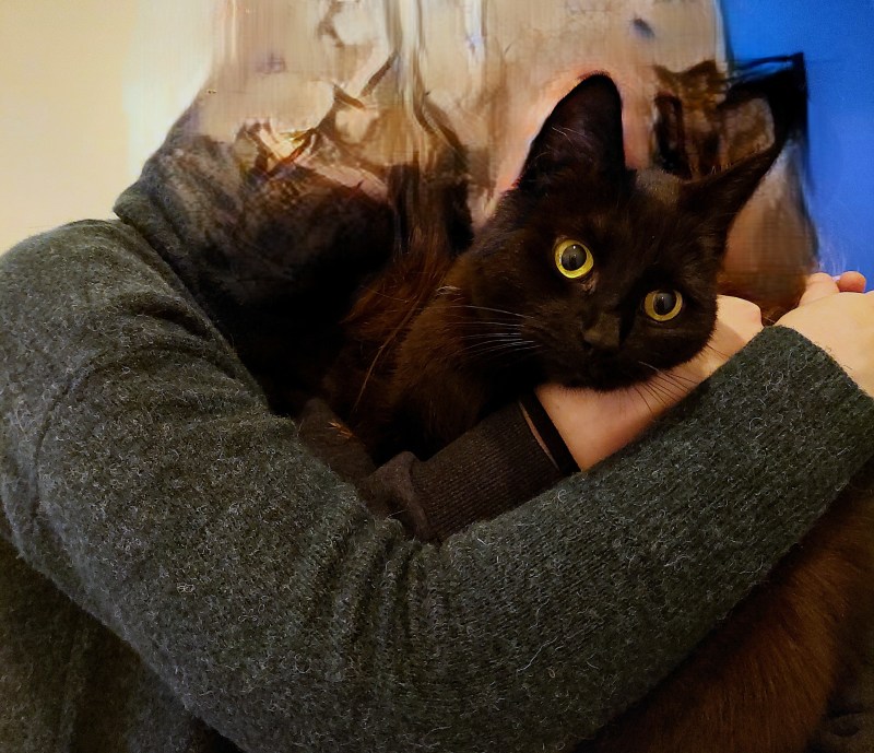 Kanske är det samma kisse som i förra bilden. Här i en varm kram med både matte och mattes storasyster. AI har hjälpt mig att anonymisera mina döttrar, vilket de båda har som önskemål. En bild som passar bra i anknytning till Halloween, några dagar i efterskott.