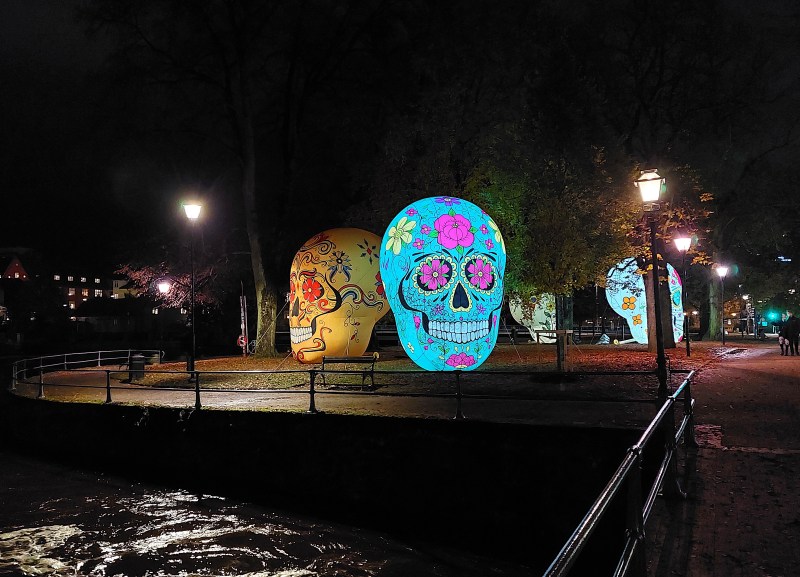 Vi hängde med hem till min dotter igen och efter ca en halvtimme var det dags att gå till tåget. Vi missbedömde hur lång tid det skulle ta att gå dit och trodde att vi hade gott om tid. Jag stannade till en kort stund för att fota skallarna i Slottsparken. Enligt AI-sammafattningen är de ”lysande skallarna” sju gigantiska färgstarka dödskallar inspirerade av den mexikanska högtiden Día de los muertos (de dödas dag) Dessa installationer brukar finnas i Slottsparken under höstlovet som en del av evenemanget Spökstaden. De är sex meter höga och lyser upp parken med vackra mönster, ofta från skymningen.