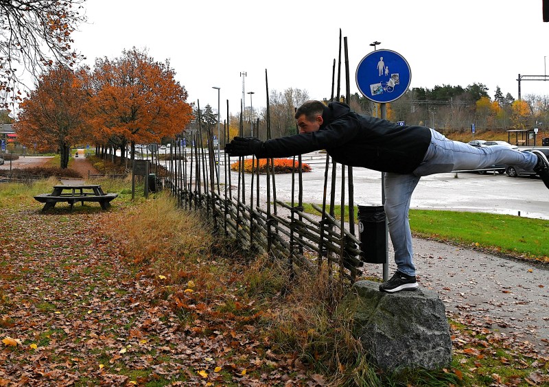 Ca halvnio på lördagsmorgonen klev vi ombord på bussen mot Enköping där vi skulle byta till tåg mot Örebro. Vi hade 35 minuter på oss i Enköping och vi hade ingen lust att bara gå in i väntsalen och sätta oss. Vi gick en liten runda och när jag skulle fota hösfärger så hamnade även min balanstränande son i bilden. Han får gärna vara med i alla bilder om han vill det.