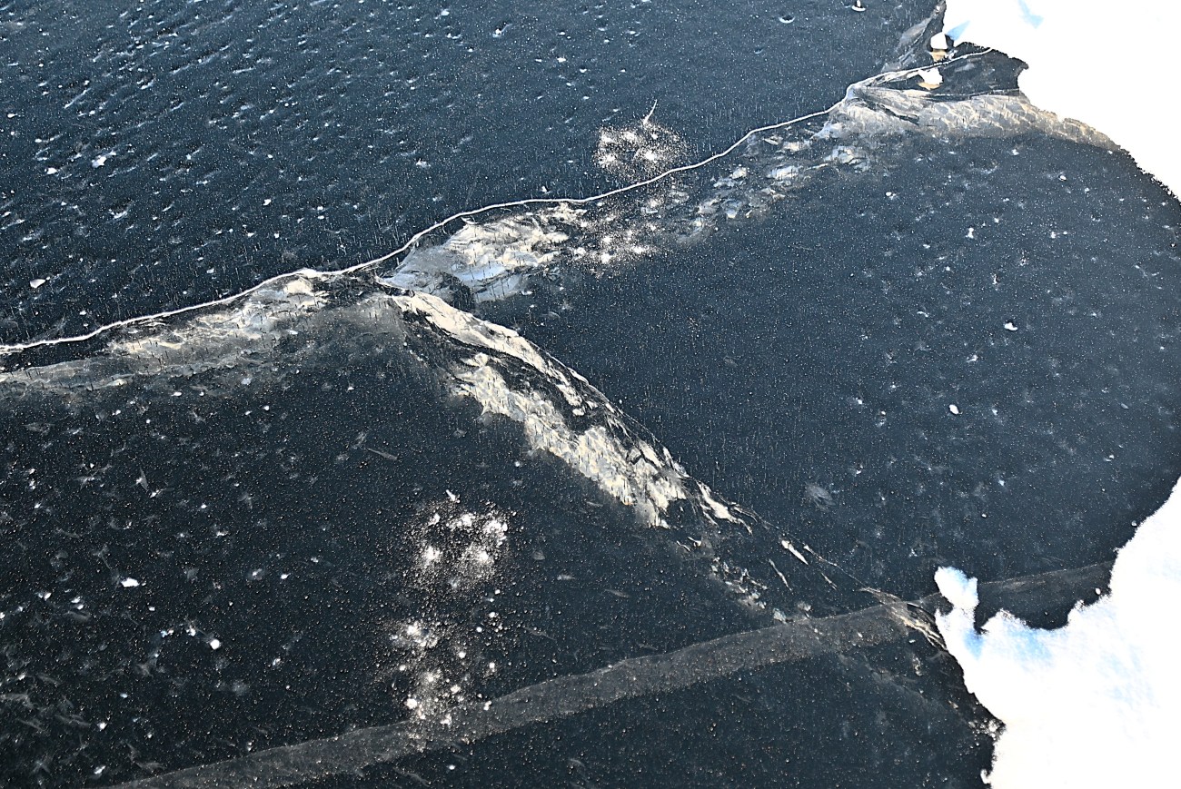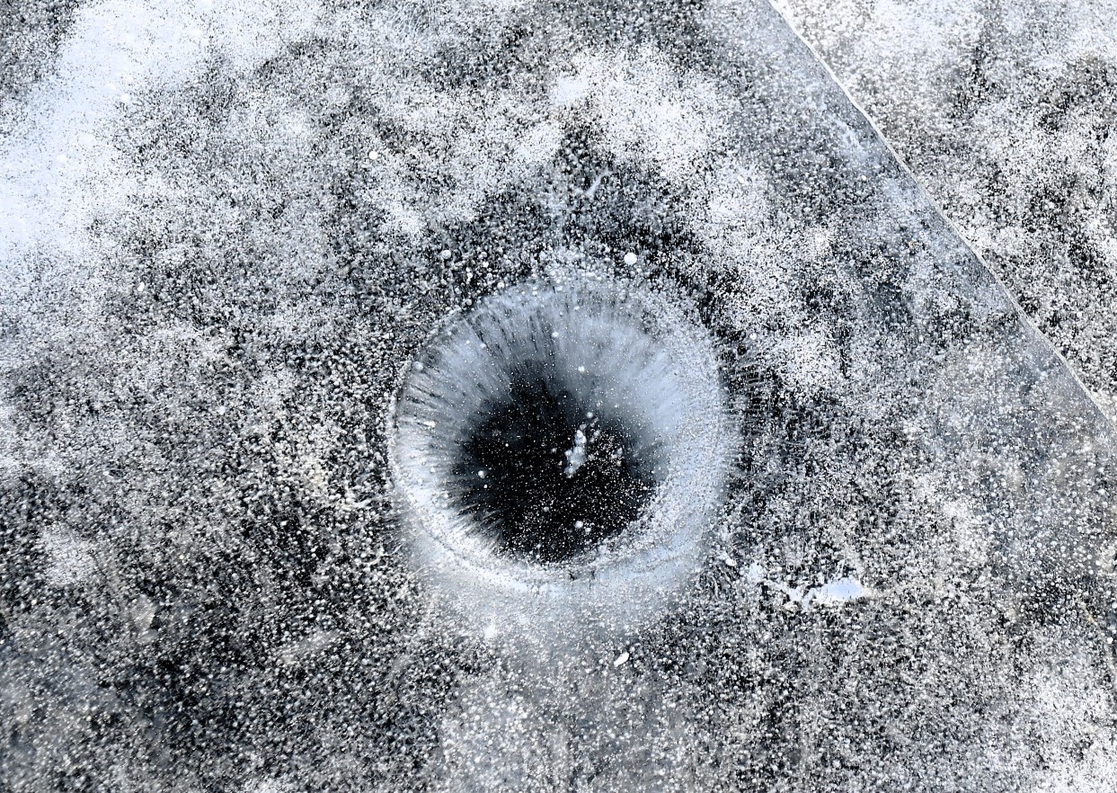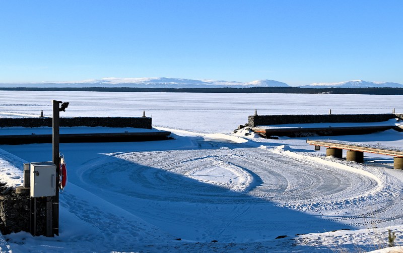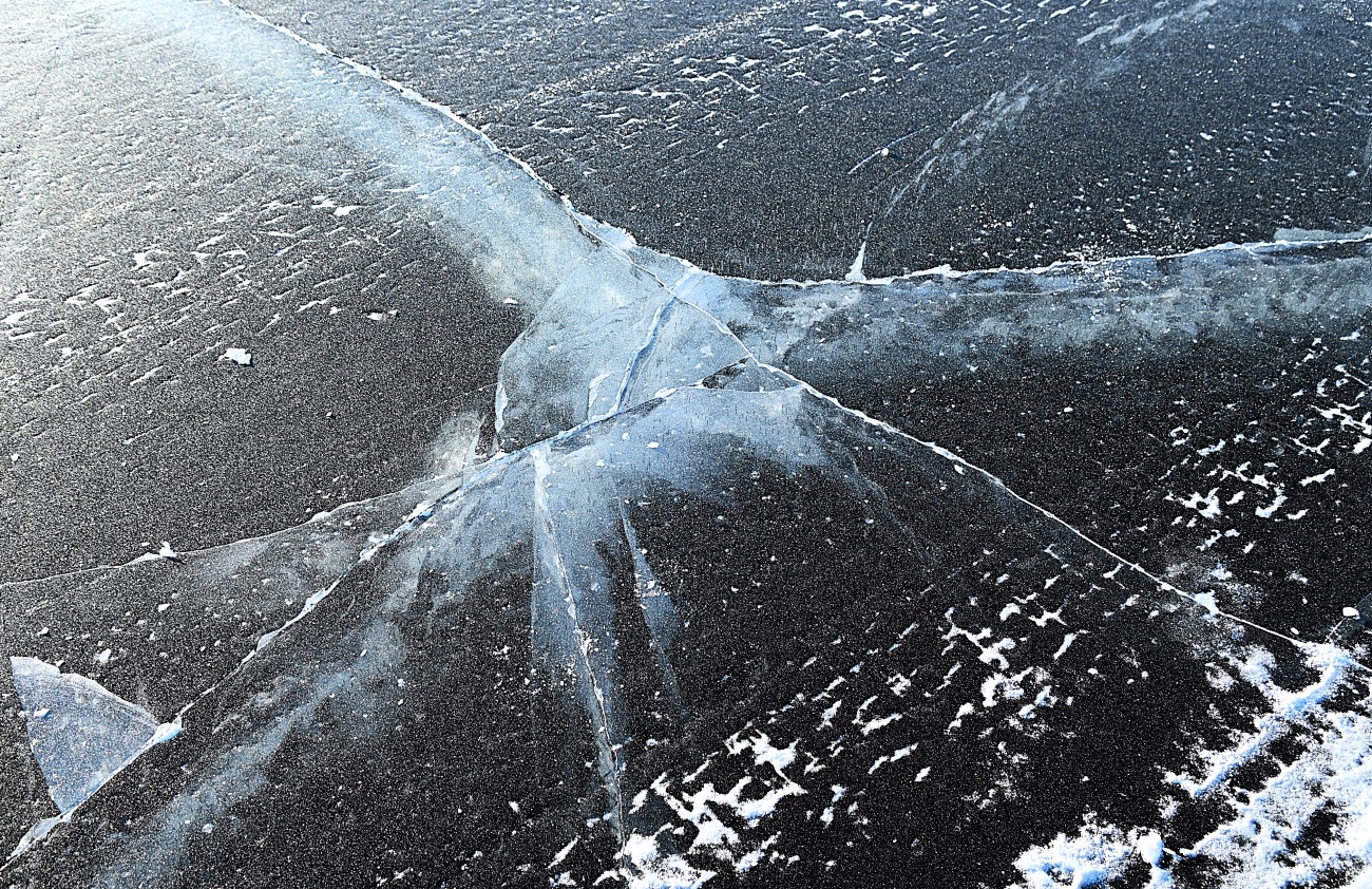 Det är inte bara naturen runt omkring som bjuder på mycket att titta på. Även isen är spännande. Det är svårt att se på bilderna eftersom de inte är i 3D men det är ganska fascinerande att se hur isen har rejäla spår efter hur den har packats ihop med sprickbildning och olika mönster som följd. Sprickbildning låter läskigt men de här gör inte isen ett dugg svag. Däremot kan man se att isen är minst några dm tjock. Det runda hålet ser nästan ut som ett öga men jag gissar att någon har satt ner en stav där och att det sedan har frusit till. Jag såg en hel del liknande ”ögon”.