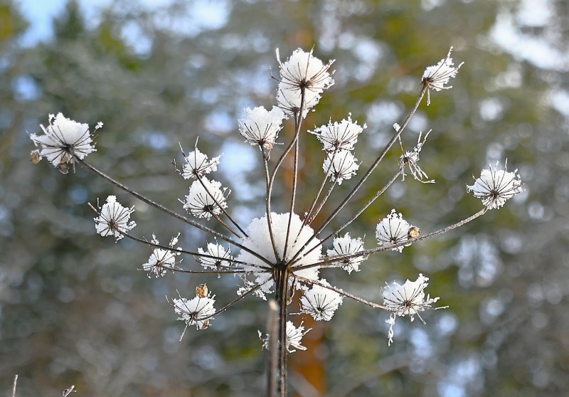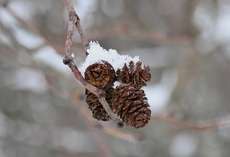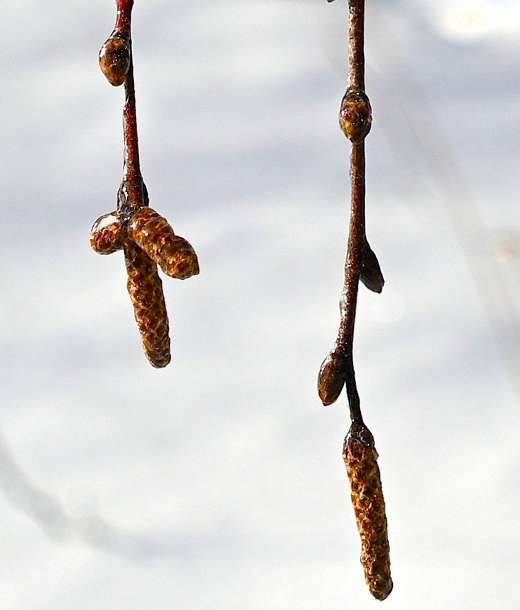 Det är fortfarande vinter och en hel del snö men träden är helt befriade från rimfrost. Lite snö ser jag på grenar här och där men efter ganska många härliga dagar med tjock rimfrost känns det mindre lockande att fota vinterlandskapet när träden nästan är kala. Men då får man leta efter annat och varför inte i stället visa på en del små detaljer i naturen. Bilderna är från några promenader under veckan som gått. Det dröjer nog innan det släpps pollen här, även om isen runt om hängena snart smälter bort. Kanske har det redan hänt eftersom det har varit några plusgrader idag.