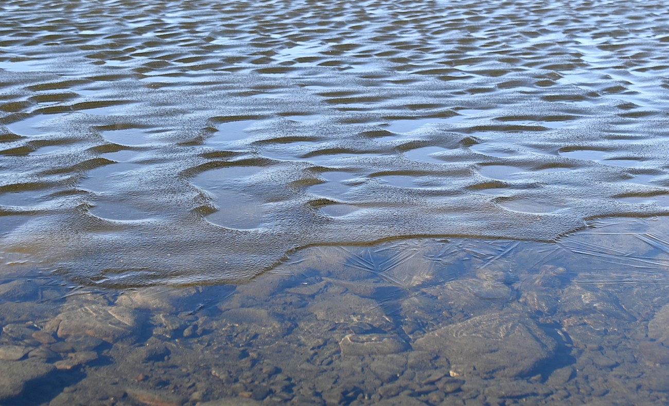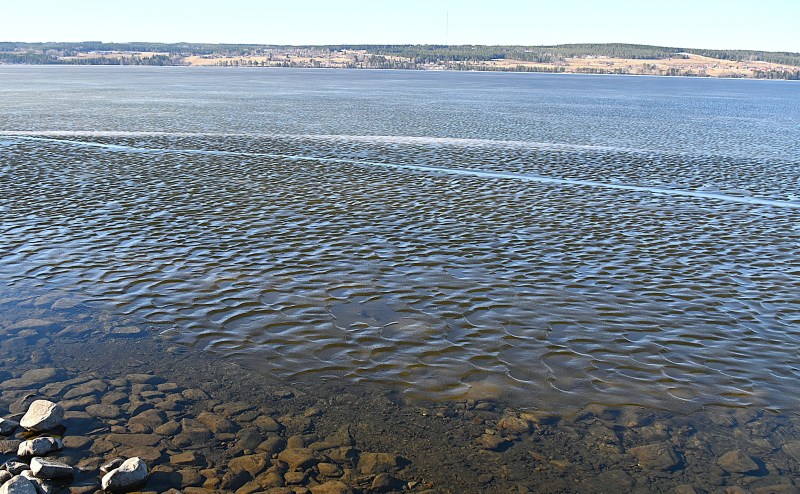 Den smältande isen såg märklig ut och förmodligen är det vindar och rörelser i vattnet under den tunna isen som har åstadkommit det här mönstret.