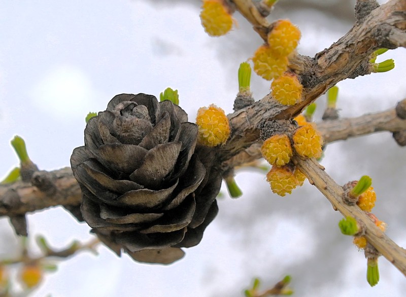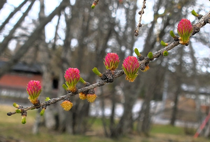 Lärkträdens små blivande kottar i olika stadier.