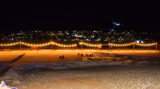 Upplogat och klart för olika typer av skridskoåkning och med Frösön som bakgrund. Den lilla labyrinten i hörnet av ena området kanske är en rolig detalj för alla barn.